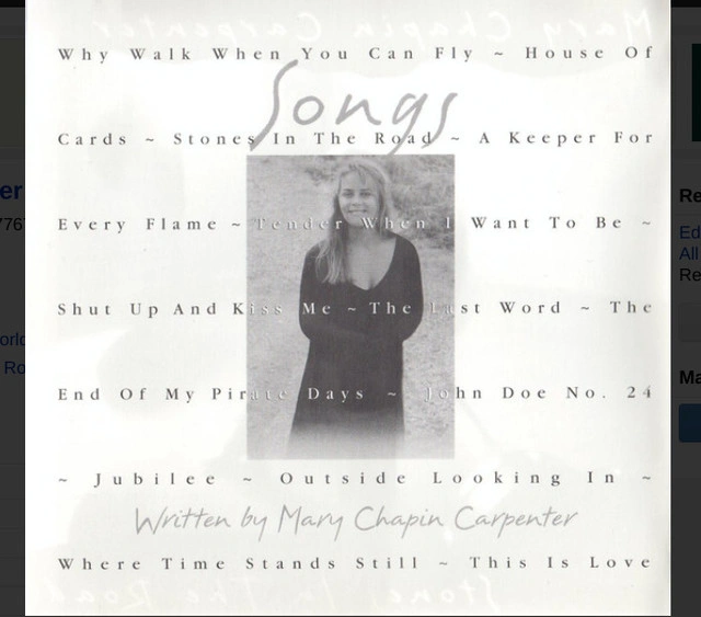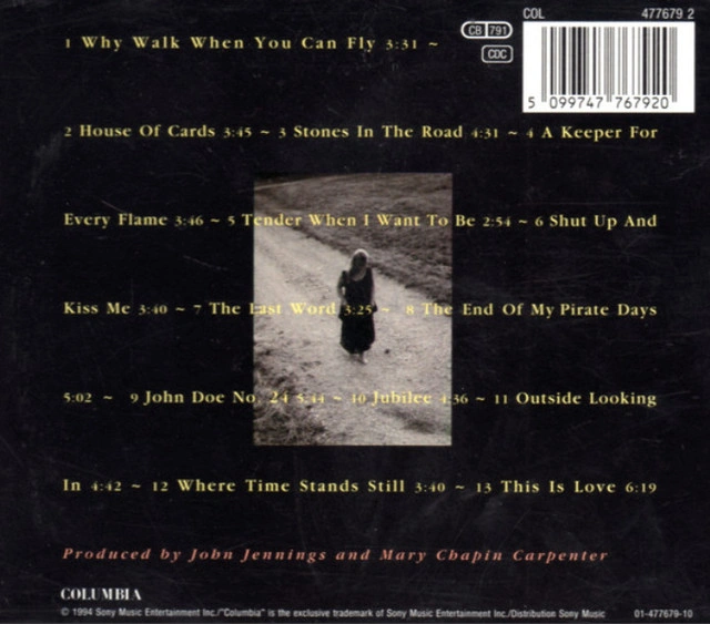 Stones In The Road Carpenter, Mary Chapin (Artist) Format : CD 1 Why Walk When You Can Fly 3:31 2 House Of Cards 3:45 3 Stones In The Road 4:31 4 A Keeper For Every Flame 3:46 5 Tender When I Want To Be 2:54 6 Shut Up And Kiss Me 3:40 7 The Last Word 3:25 8 The End Of My Pirate Days 5:02 9 John Doe No. 24 5:44 10 Jubilee 4:36 11 Outside Looking In 4:42 12 Where Time Stands Still 3:40 13 This Is Love 6:19 Condition: Used - Like new