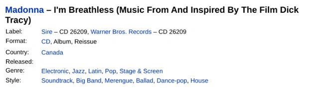 I'm Breathless: Music from and Inspired by the Film Dick Tracy Madonna (Artist) Format: CD Condition: Used - Like new For Sale By: Owner