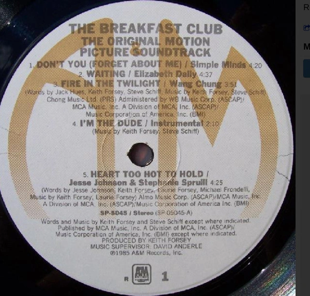 The Breakfast Club Soundtrack, Keith Forsey (Composer) Format: Audio CD Simple Minds– Don't You (Forget About Me) 4:20 Elizabeth Daily*– Waiting 4:37 Wang Chung– Fire In The Twilight 3:51 Keith Forsey– I'm The Dude 2:10 Jesse Johnson & Stephanie Spruill– Heart Too Hot To Hold 4:25 Gary Chang– Dream Montage 2:37 Karla DeVito– We Are Not Alone 3:39 Keith Forsey– The Reggae 3:07 Joyce Kennedy– Didn't I Tell You 4:47 Keith Forsey– Love Theme 4:26 Condition: Used - Like new