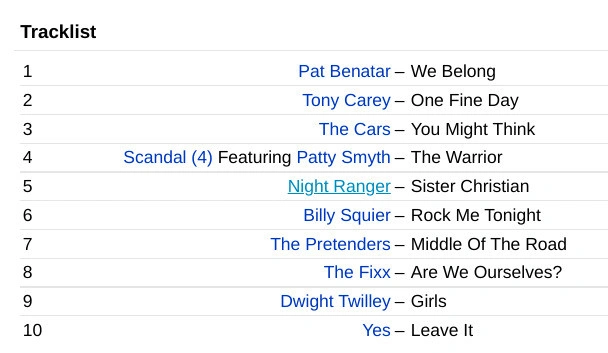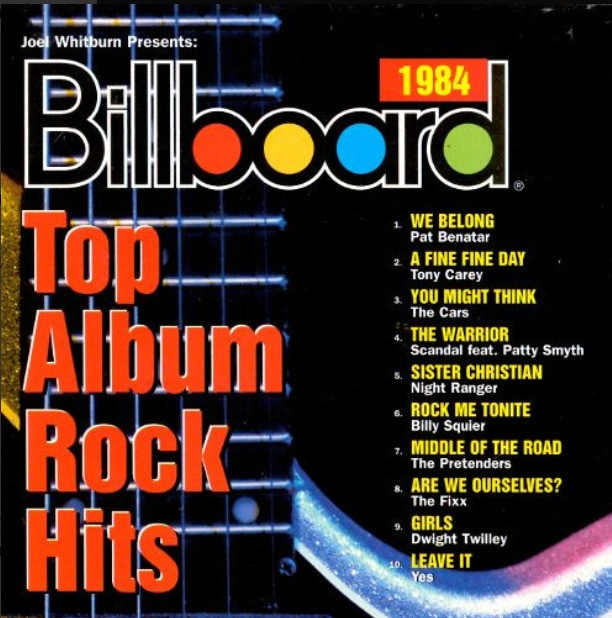 Billboard Top Album Rock Hits 1984 Various Artists (Artist) Format: Audio CD 1 Pat Benatar– We Belong 2 Tony Carey– One Fine Day 3 The Cars– You Might Think 4 Scandal (4) Featuring Patty Smyth– The Warrior 5 Night Ranger– Sister Christian 6 Billy Squier– Rock Me Tonight 7 The Pretenders– Middle Of The Road 8 The Fixx– Are We Ourselves? 9 Dwight Twilley– Girls 10 Yes– Leave It Condition: Used - Like new For Sale By: Owner