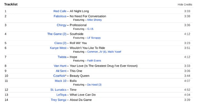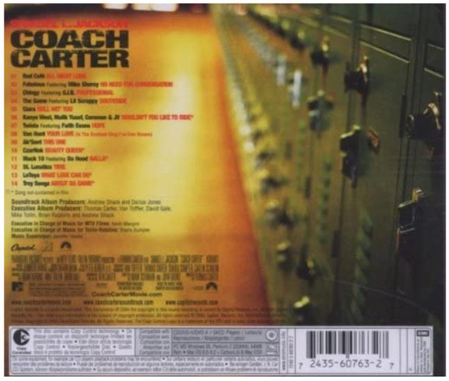 Coach Carter Music From The M Various (Artist) Format: Audio CD Various – Coach Carter Soundtrack Label: Capitol Records – TOCP-66372 Format: CD, Compilation, Copy Protected Country: Japan Released: 2005 Genre: Hip Hop, Stage & Screen Style: Soundtrack,, Pop Rap 1 Red Cafe– All Night Long 3:33 2 Fabolous– No Need For Conversation Featuring – Mike Shorey 3:38 3 Chingy– Professional Featuring – G.I.B. 3:36 4 The Game (2)– Southside Featuring – Lil' Scrappy 4:12 5 Ciara (2)– Roll Wit' You 3:23 6 Kanye West– Wouldn't You Like To Ride Featuring – Common, JV (6), Malik Yusef 3:51 7 Twista– Hope Featuring – Faith Evans 4:12 8 Van Hunt– Your Love (Is The Greatest Drug I've Ever Known) 3:33 9 Ak'Sent– This One 3:06 10 CzarNok*– Beauty Queen 3:44 11 Mack 10– Balla Featuring – Da Hood (3) 4:07 12 St. Lunatics– Time 4:52 13 LeToya– What Love Can Do 4:04 14 Trey Songz– About Da Game 3:39 Condition: Used - Like new