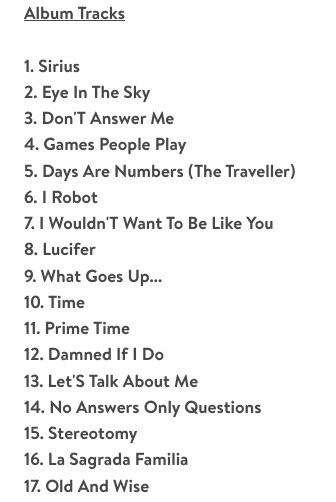 The Best Of The Alan Parsons Project Parsons, Alan (Artist) Format: Audio CD 1. Sirius 2. Eye In The Sky 3. Don'T Answer Me 4. Games People Play 5. Days Are Numbers (The Traveller) 6. I Robot 7. I Wouldn't Want To Be Like You 8. Lucifer 9. What Goes Up... 10. Time 11. Prime Time 12. Damned If I Do 13. Let'S Talk About Me 14. No Answers Only Questions 15. Stereotomy 16. La Sagrada Familia 17. Old And Wise Condition: Used - Like new For Sale By: Owner