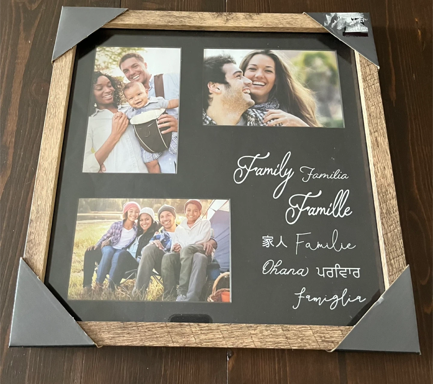 Here's a lovely new rustic-style photo frame with the word "Family" written in multiple languages. It's perfect for displaying your cherished memories!