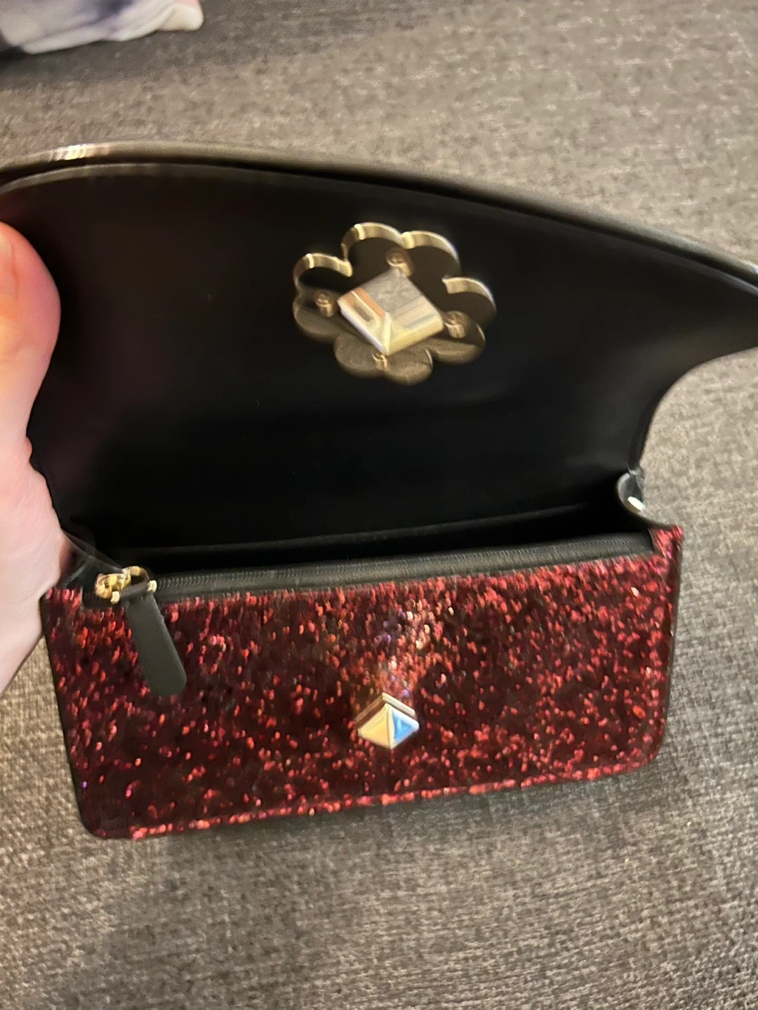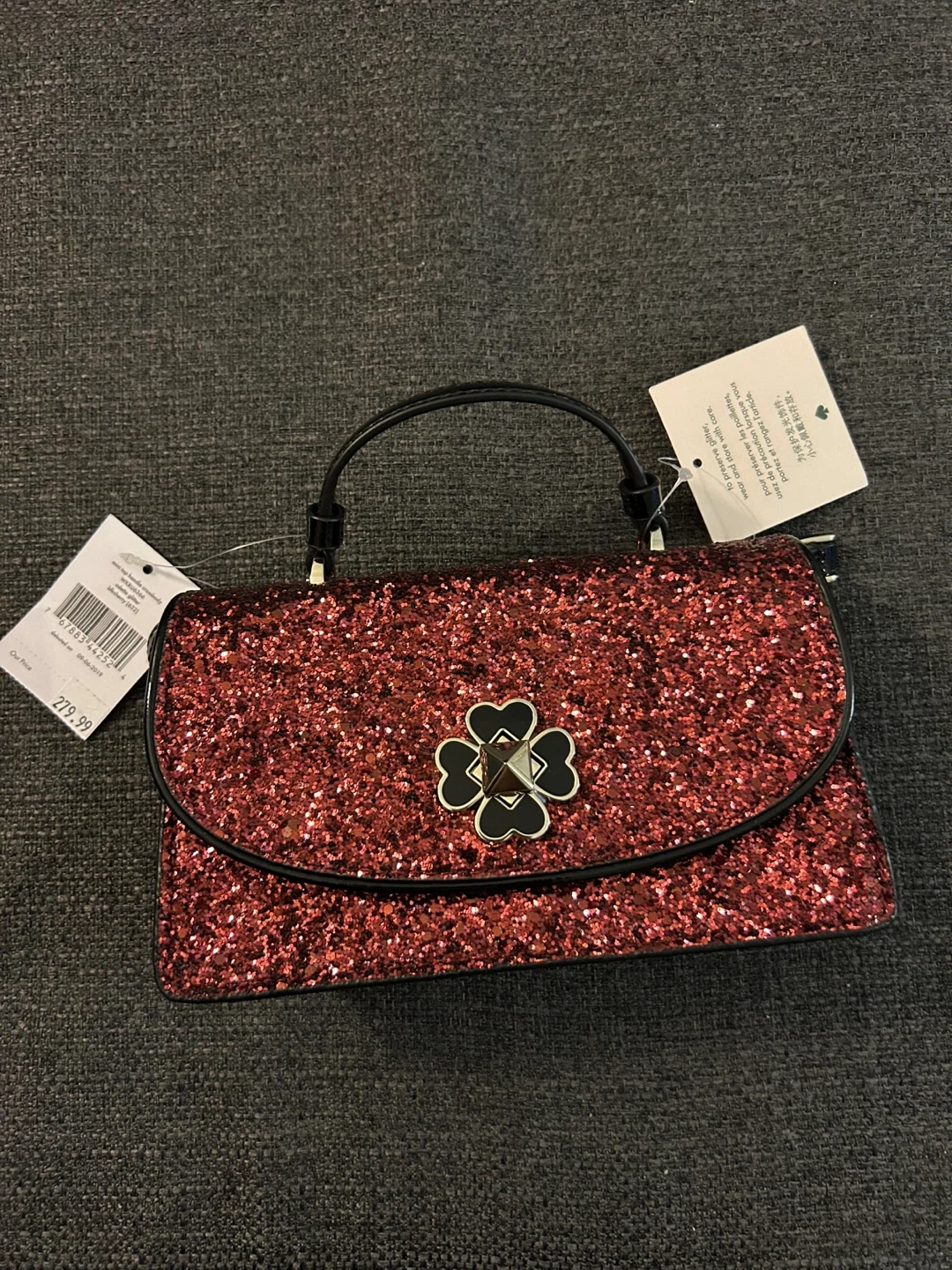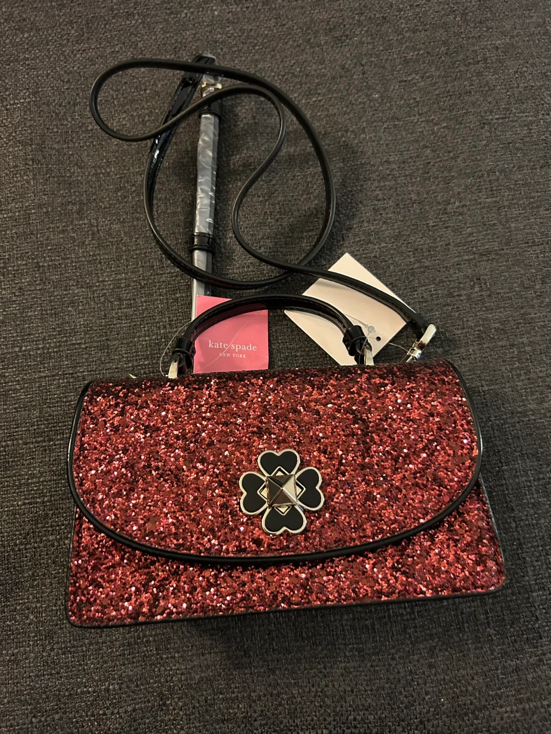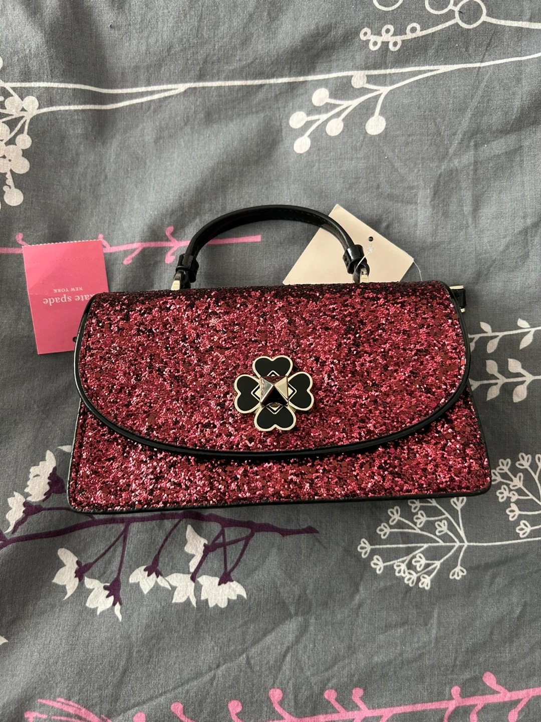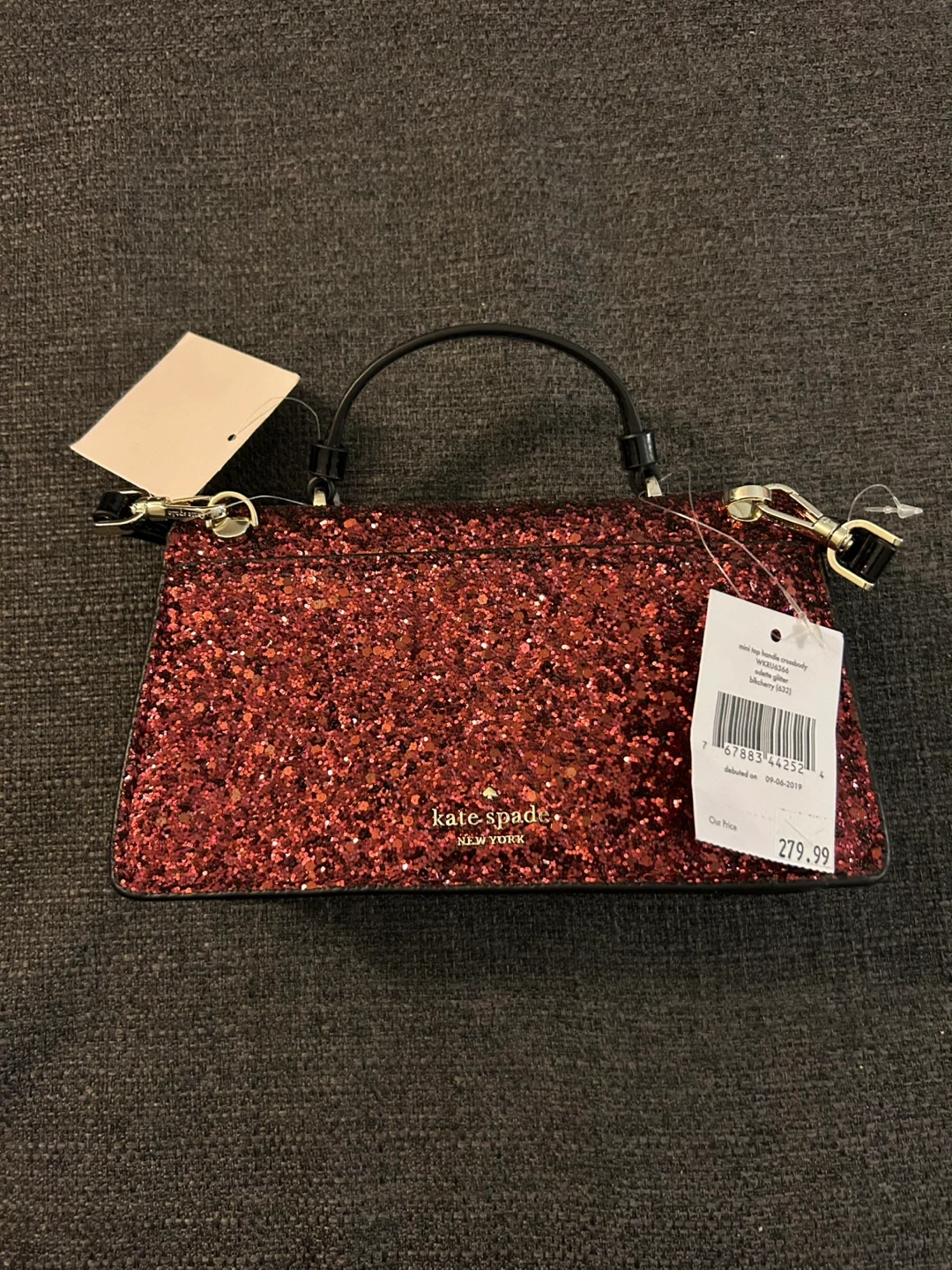 Kate Spade Mini Top Handle Crossbody bag in Odette Glitter Black Cherry. New with tags, stored safely to preserve the quality of the glitter finish. Makes a great gift. Perfect for a night out or for seasonal events. Fits approximately a large iPhone, slots for cards, and essentials (lipstick, etc.) Mini Size: 4.75" (H) x 8" (L) X 2." (D) SF & PF Home. Pick up at Yonge & Davenport.