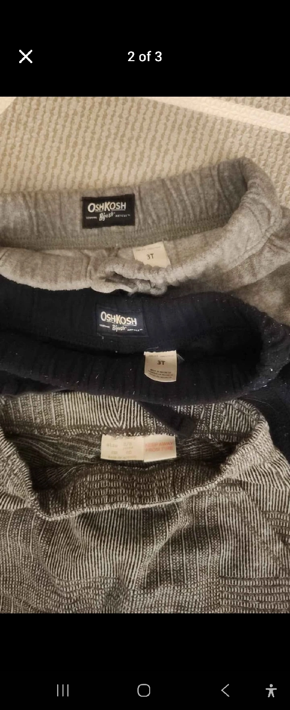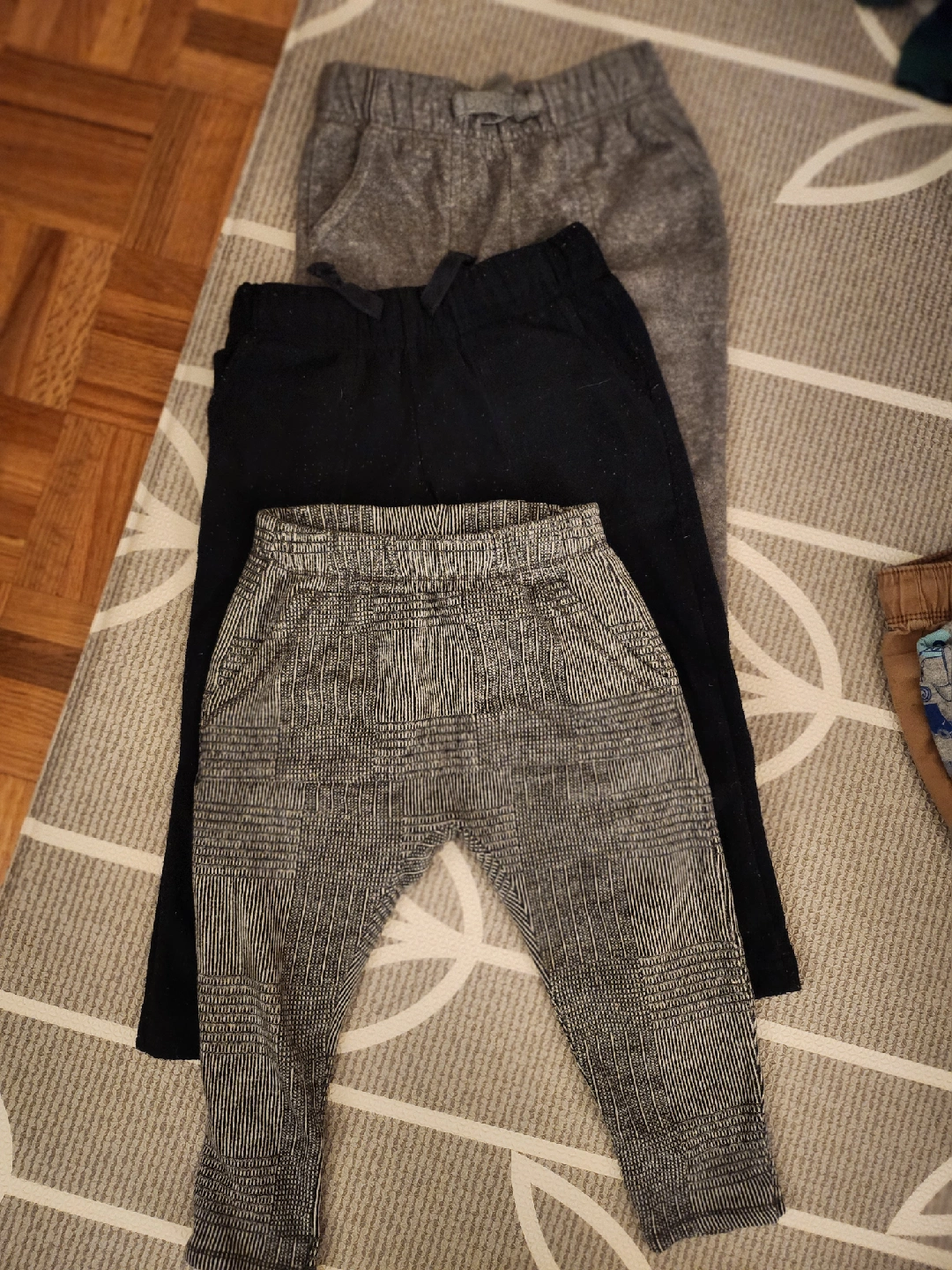 overall GUC , imperfections noted below 2 pairs are fleece, the Grey fleece has a tiny hole on the knee that could be patched/sewn Black pair has some pilling but still very warm Brands are Oshkosh(fleece pants-3T) and Zara baby -label marked as 2-3T Queen and Spadina West end meetup possible with advance e transfer