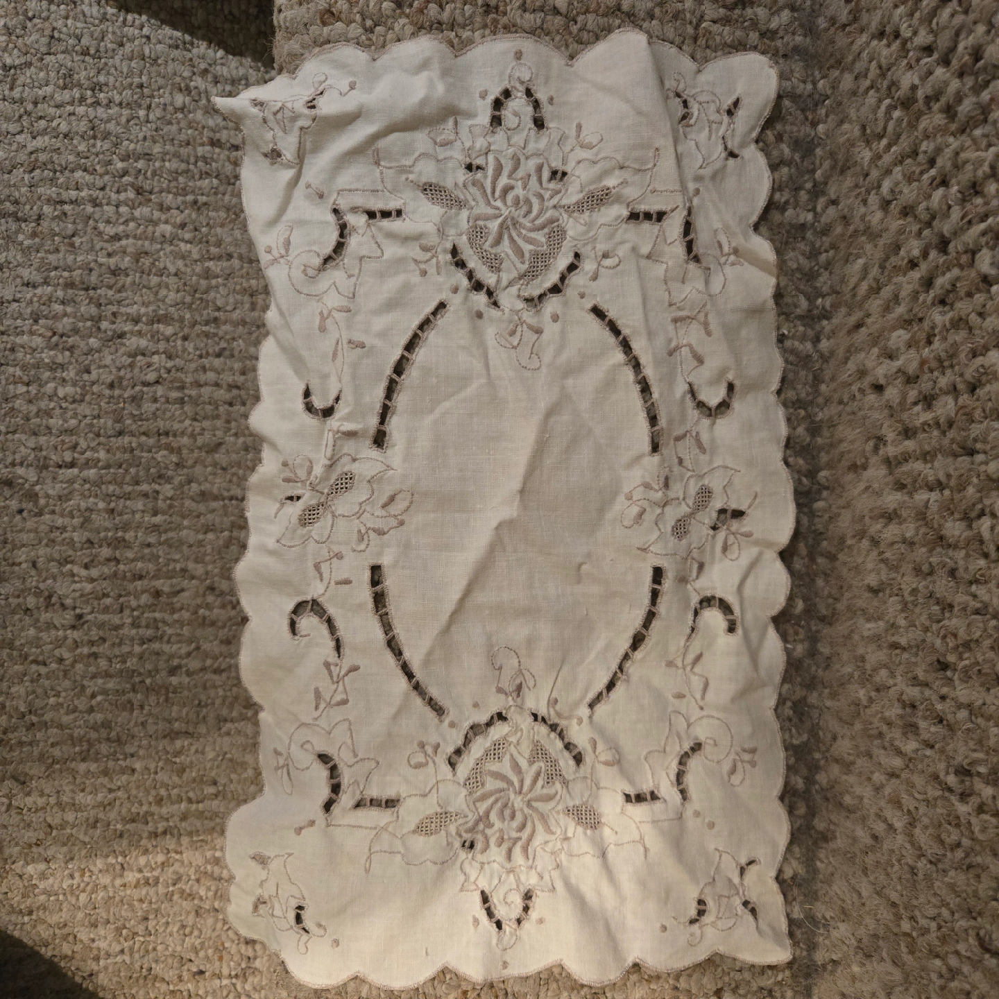 Embroidered table linen for sale. It has a beautiful floral design and scalloped edges. Perfect for adding a touch of elegance to your home