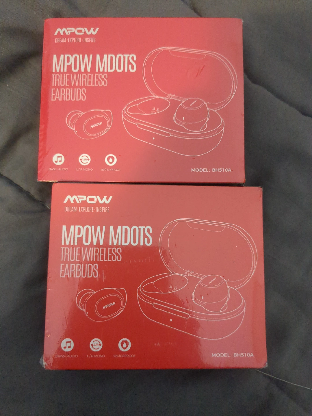 Selling a pair of brand new Mpow MDots True Wireless Earbuds! They are still in the box and have never been used. - Bluetooth Standard V5.0 - Waterproof - Bass Audio $28 each or $45 for both.