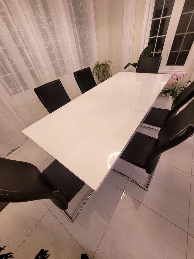 Used like new white dining set for sale as no longer in use. Please note chairs are in faux leather and worn out. Table width: 35.5'. Table regular length: 63'. Table extended length: 78.5'.