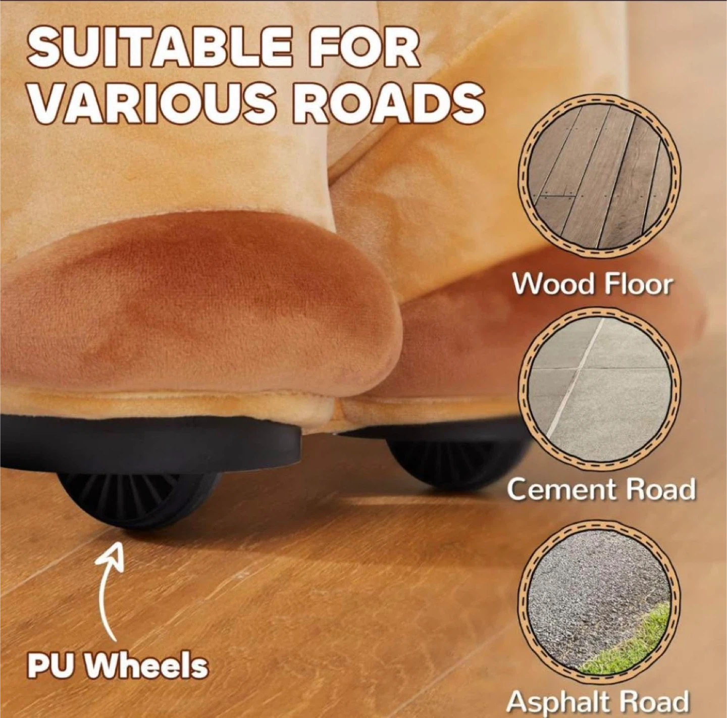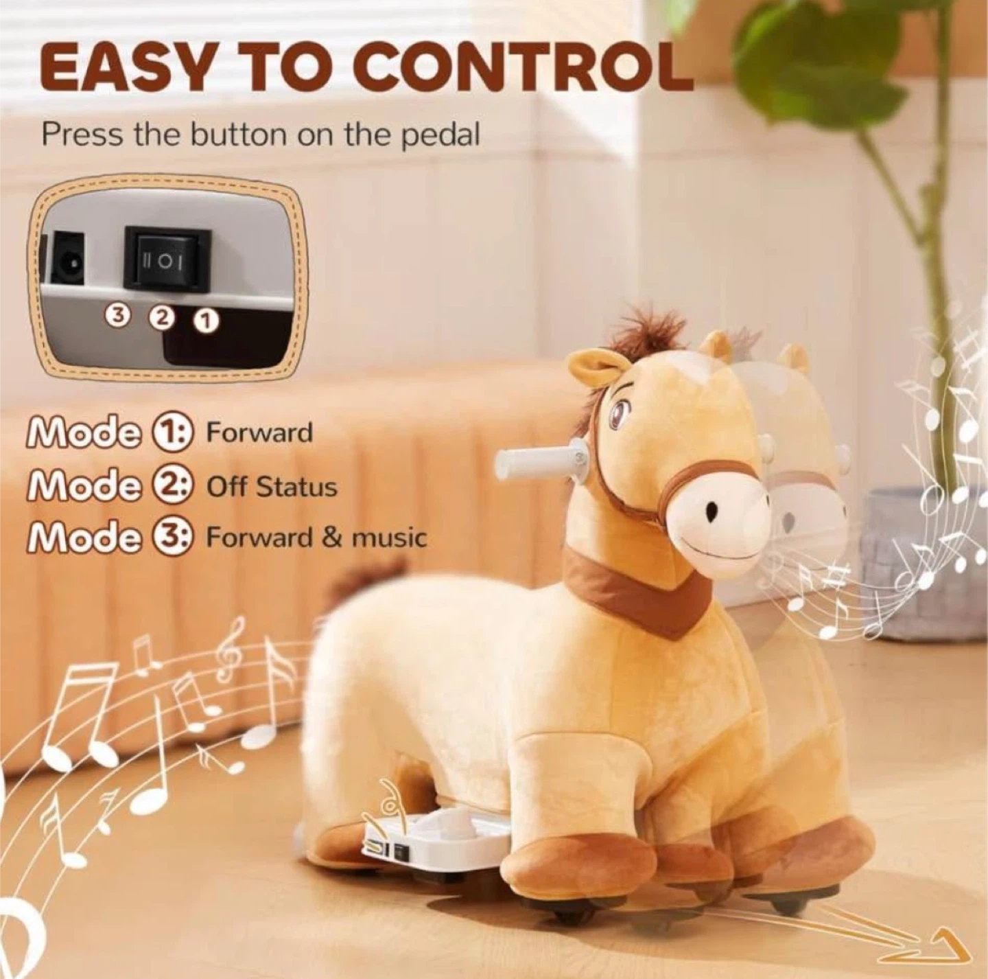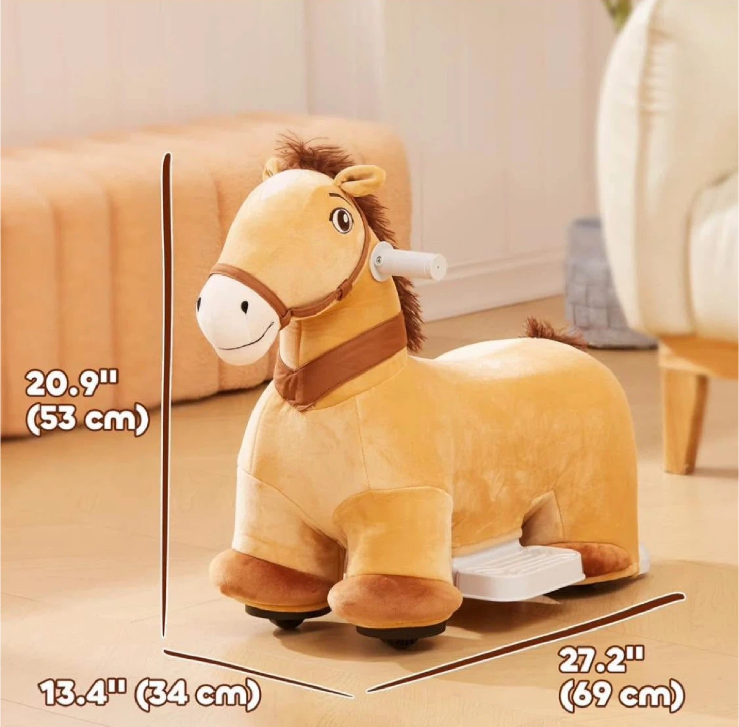 This cute ride-on plush rocking horse is perfect for little ones! It features easy-to-control modes: forward, off status, and forward with music. It's designed with PU wheels suitable for various road surfaces like wood floors, cement roads, and asphalt roads. The dimensions are approximately 20.9" (53 cm) in height, 13.4" (34 cm) in width, and 27.2" (69 cm) in length