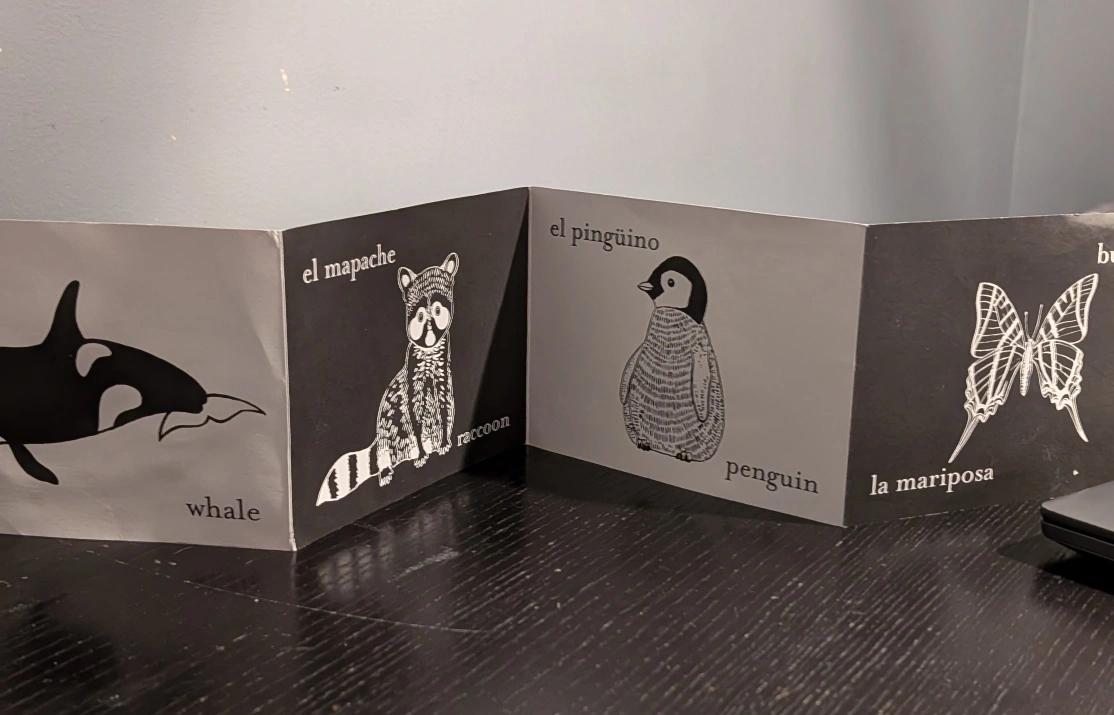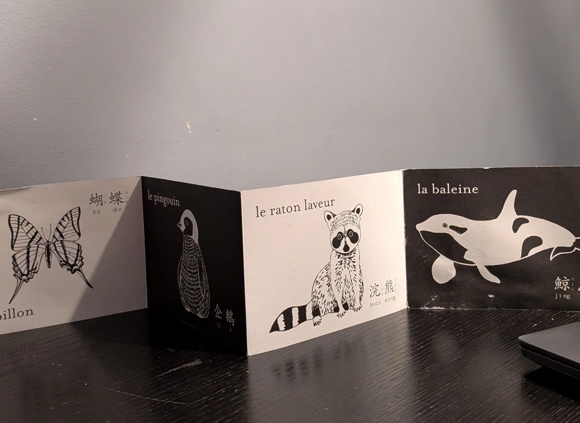 A bilingual book featuring animal names in Spanish, French, Chinese, and English. It's a great way to introduce kids to different languages and learn about animals at the same time Pickup only St Clair East and O'Connor