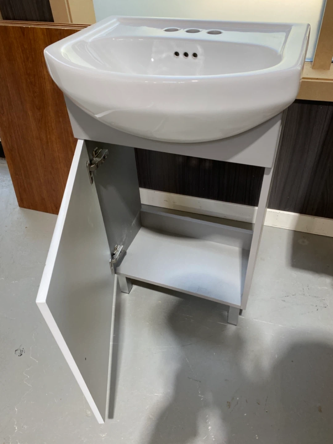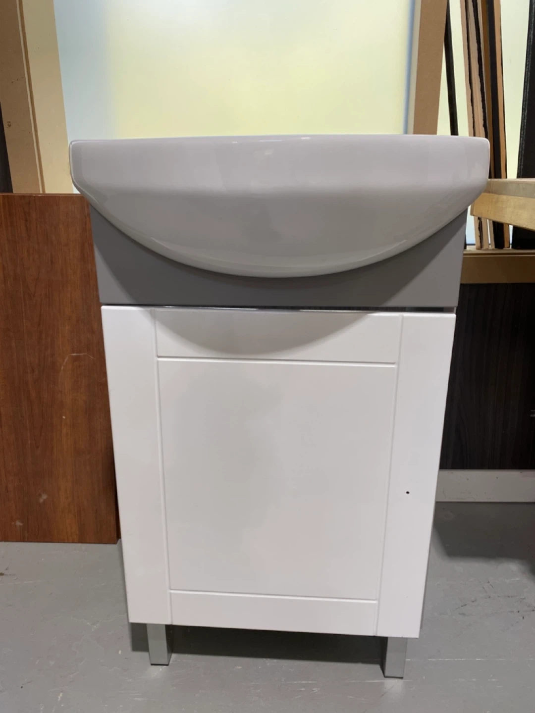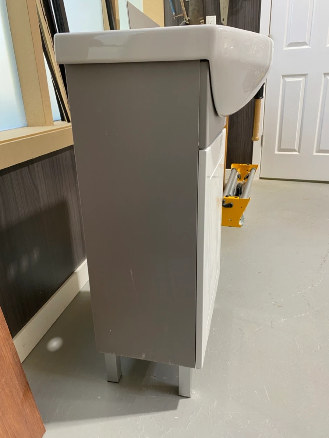 Selling a bathroom vanity with a grey top and white cabinet. It has a clean and simple design that would fit well in many bathrooms. The cabinet provides some storage space too! Sink: 19 3/4’ wide 15 5/8 long 34’ total height 18 3/8’ cabinet wide
