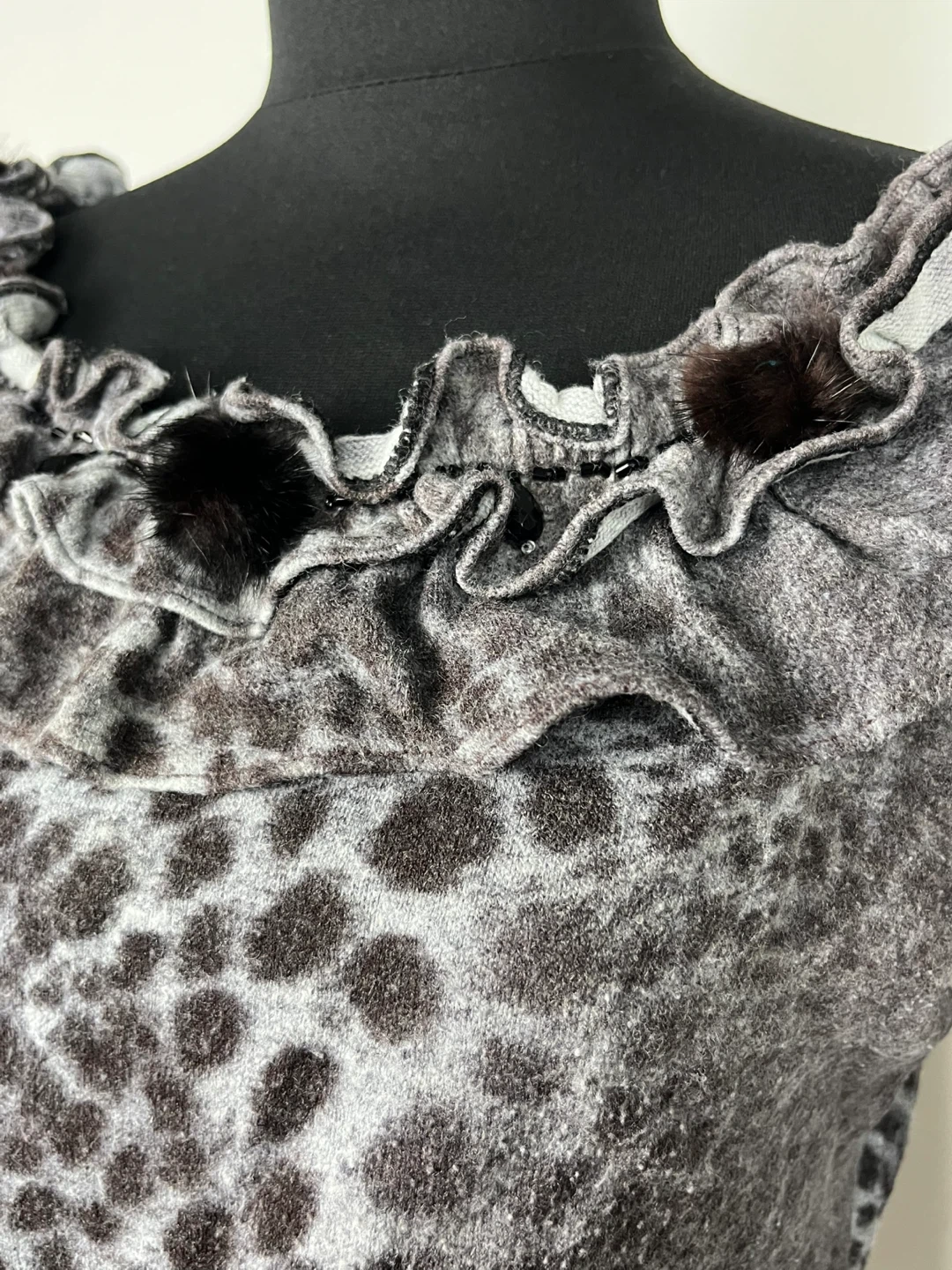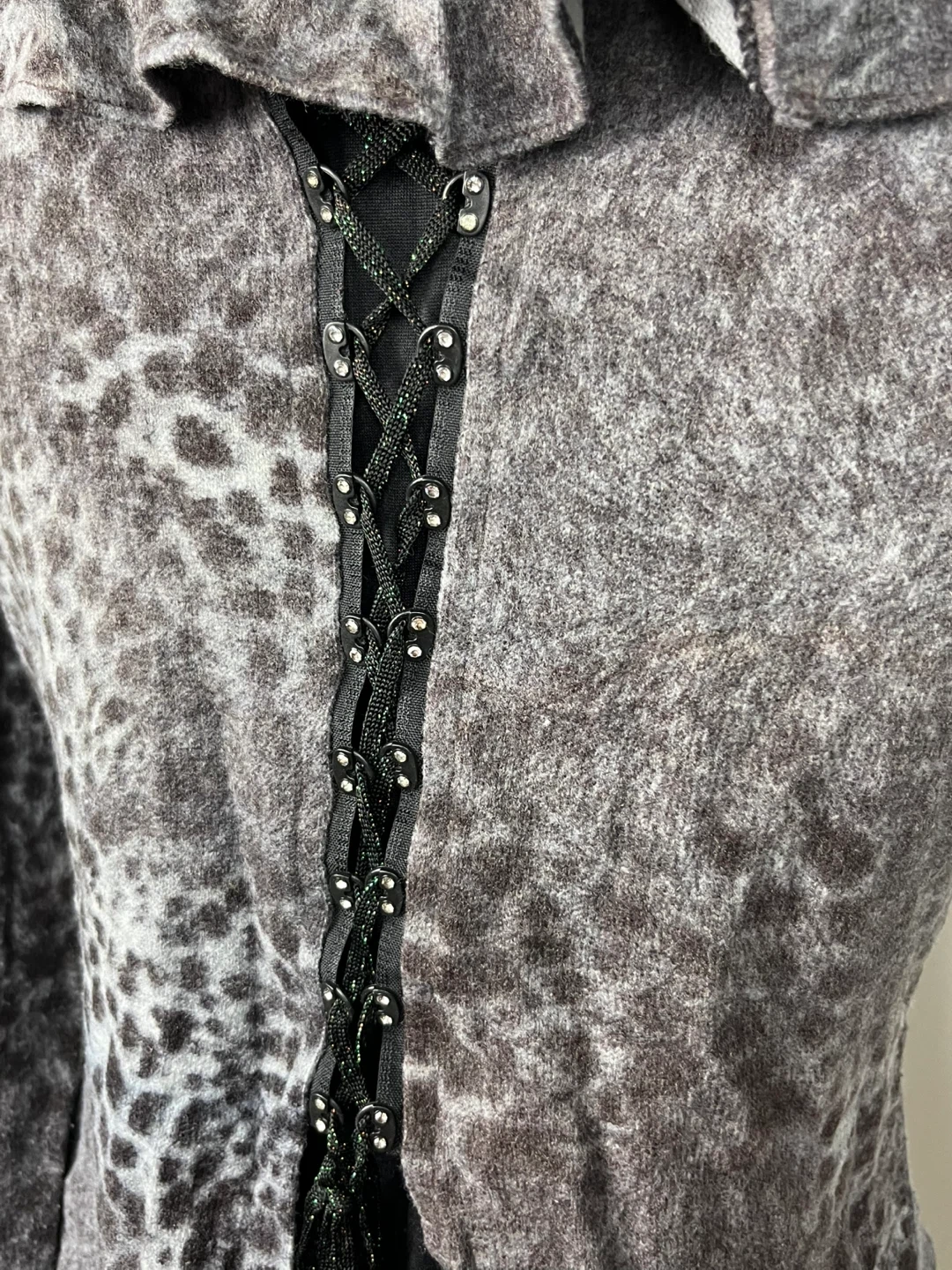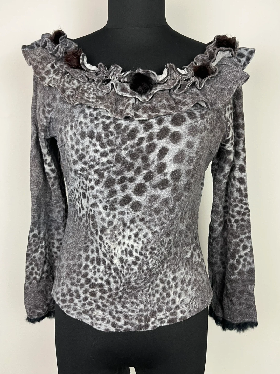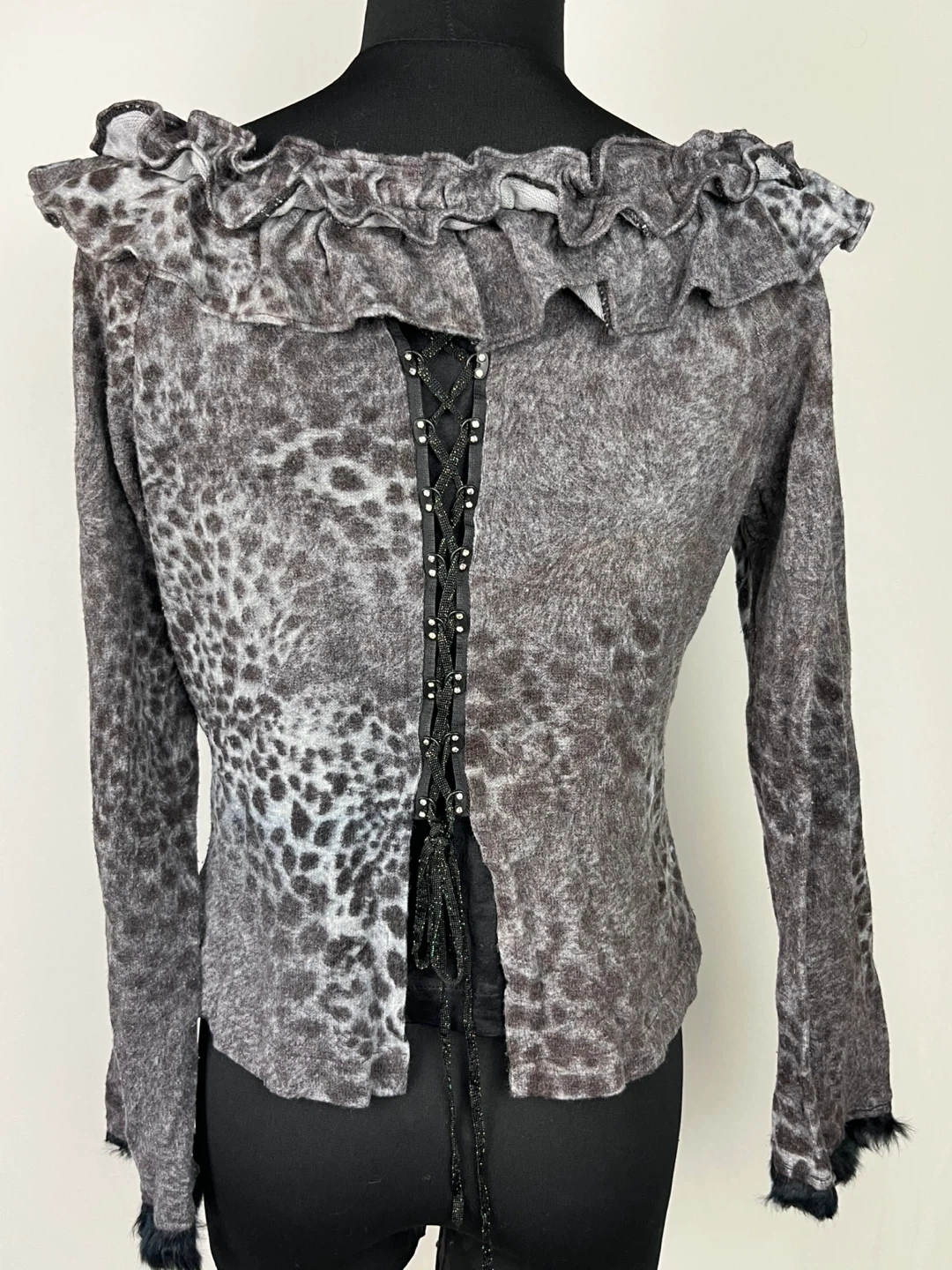 Cute animal print top with a ruffle neckline and long sleeves! It has a unique lace-up detail on the back. Pick up at Brow of the Hill near 10th and Royal, New Westminster. Check out my other listings!