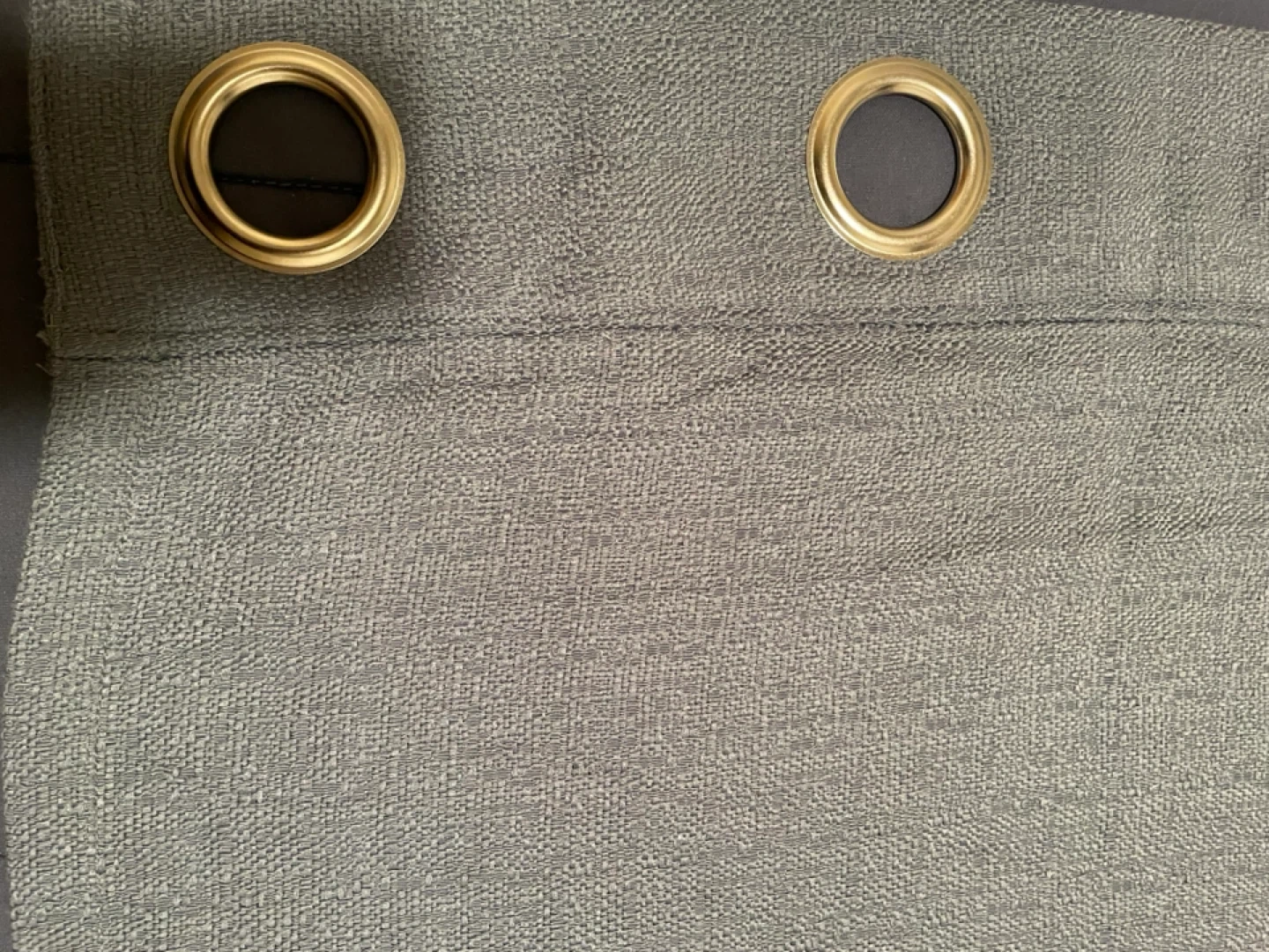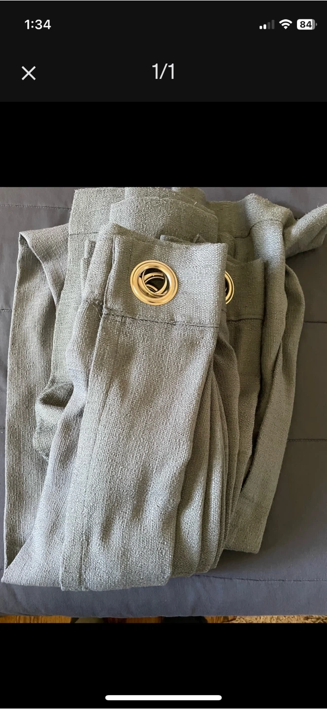 Selling (2) grey/blue curtains with gold grommets. It's in great condition and would look lovely in any room. These elegant grey drape panels, each 48 inches wide and 96 inches long, offer a touch of sophistication with their gold grommet detailing. The panels are in good condition, ready to enhance your living space. Specifications: * Colour: Grey/blue * Width: 48 inches per panel * Length: 96 inches * Detailing:
