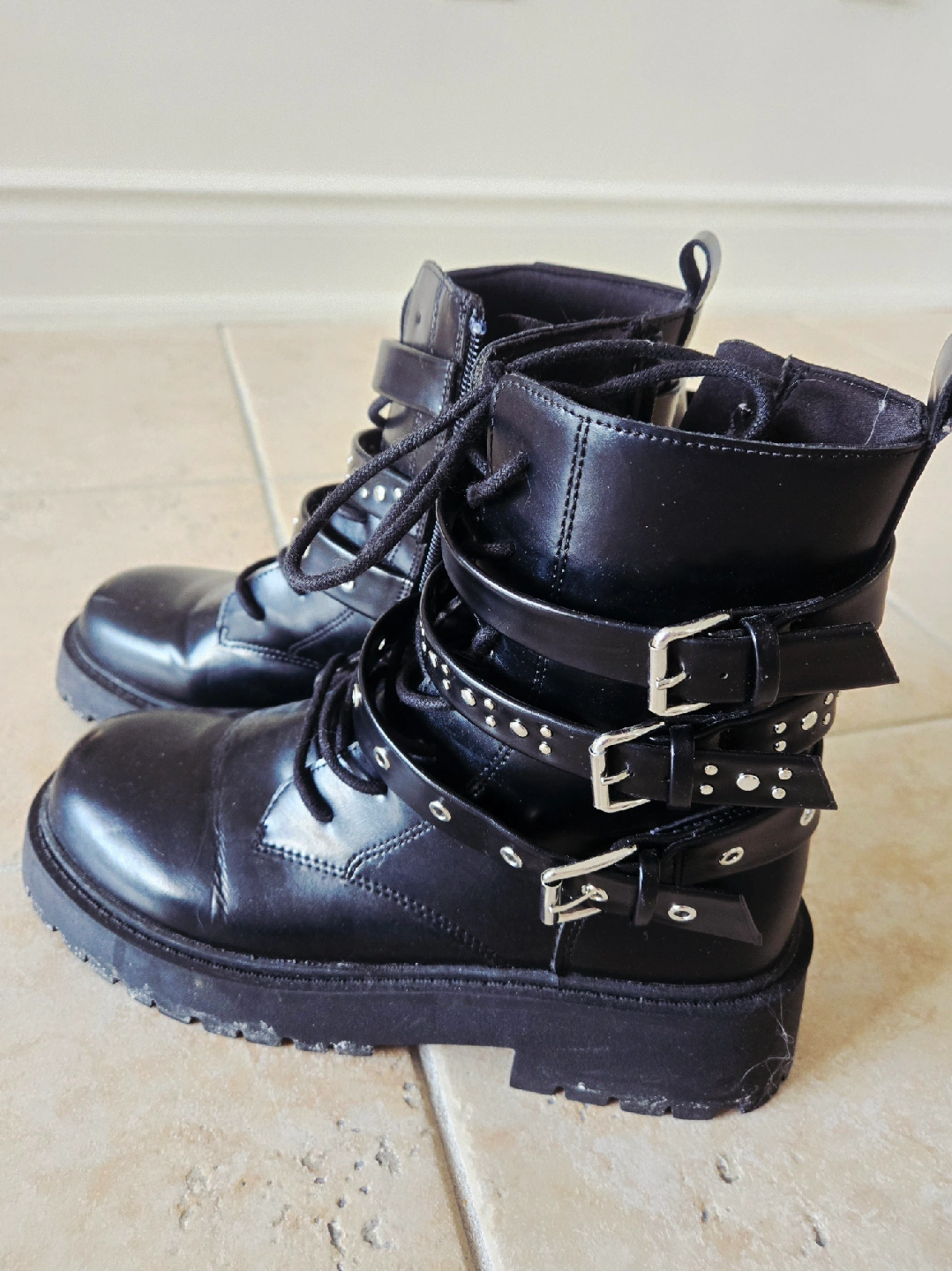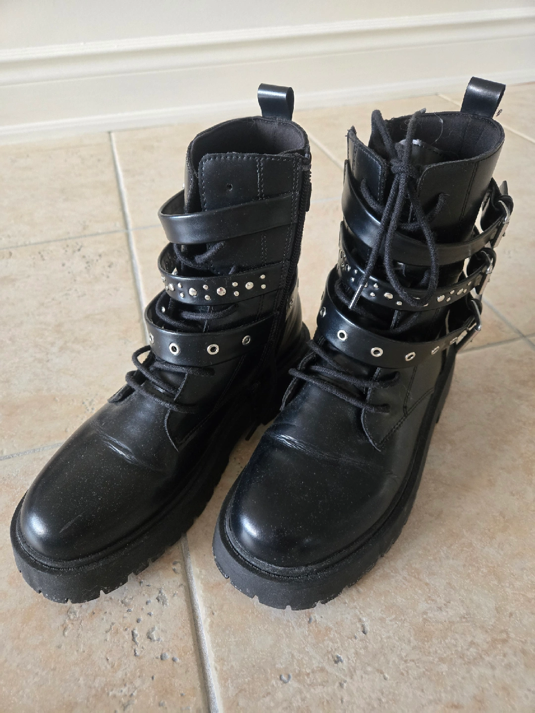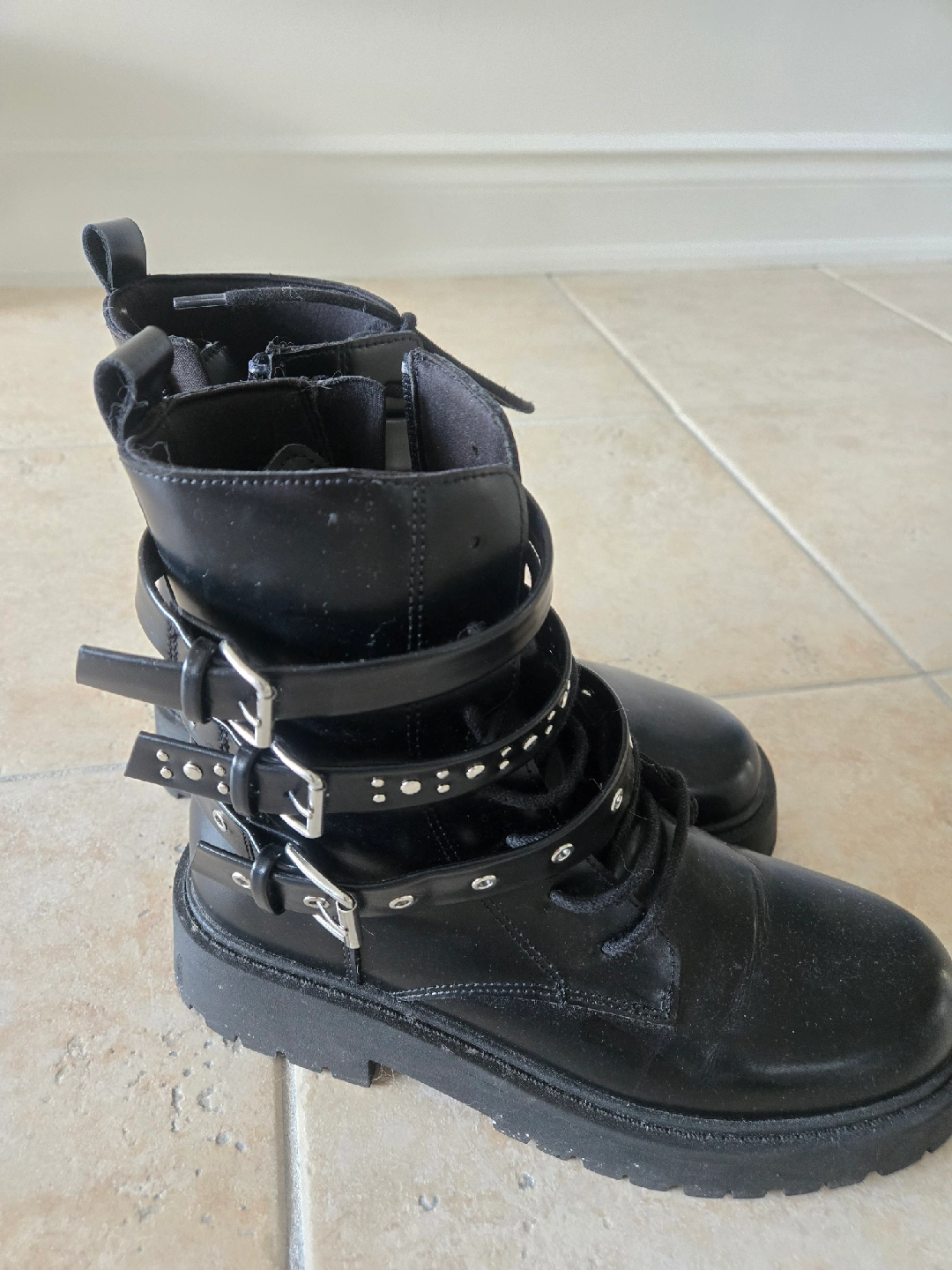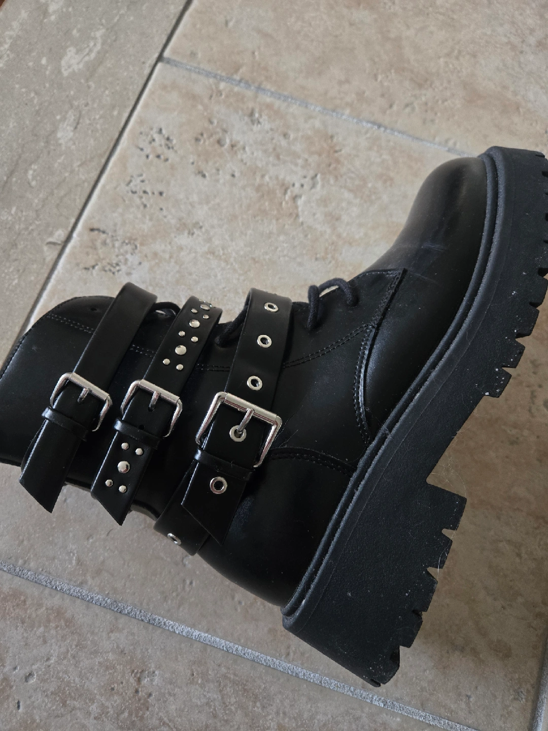 Selling a pair of black ankle boots. They have a lace-up front and buckle detailing. They're in good condition and are a size 7. Perfect for adding a bit of edge to any outfit!