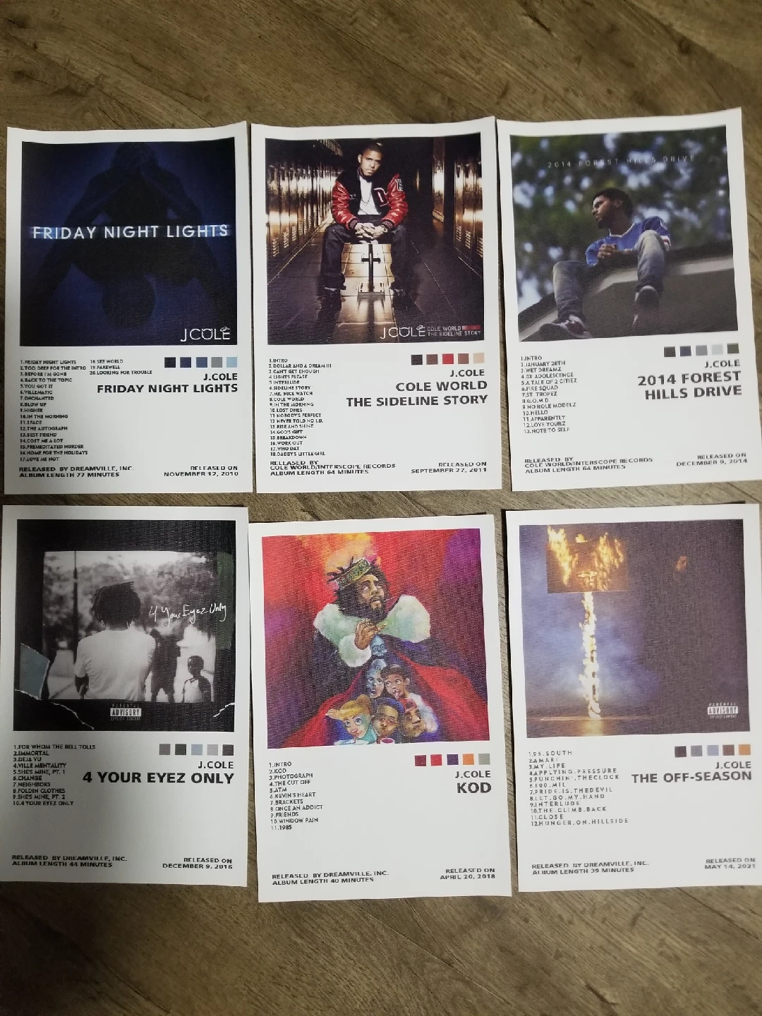 Selling a set of J. Cole album art prints! Includes: - Friday Night Lights - Cole World: The Sideline Story - 2014 Forest Hills Drive - 4 Your Eyez Only - KOD - The Off-Season Perfect for any J. Cole fan 8x12