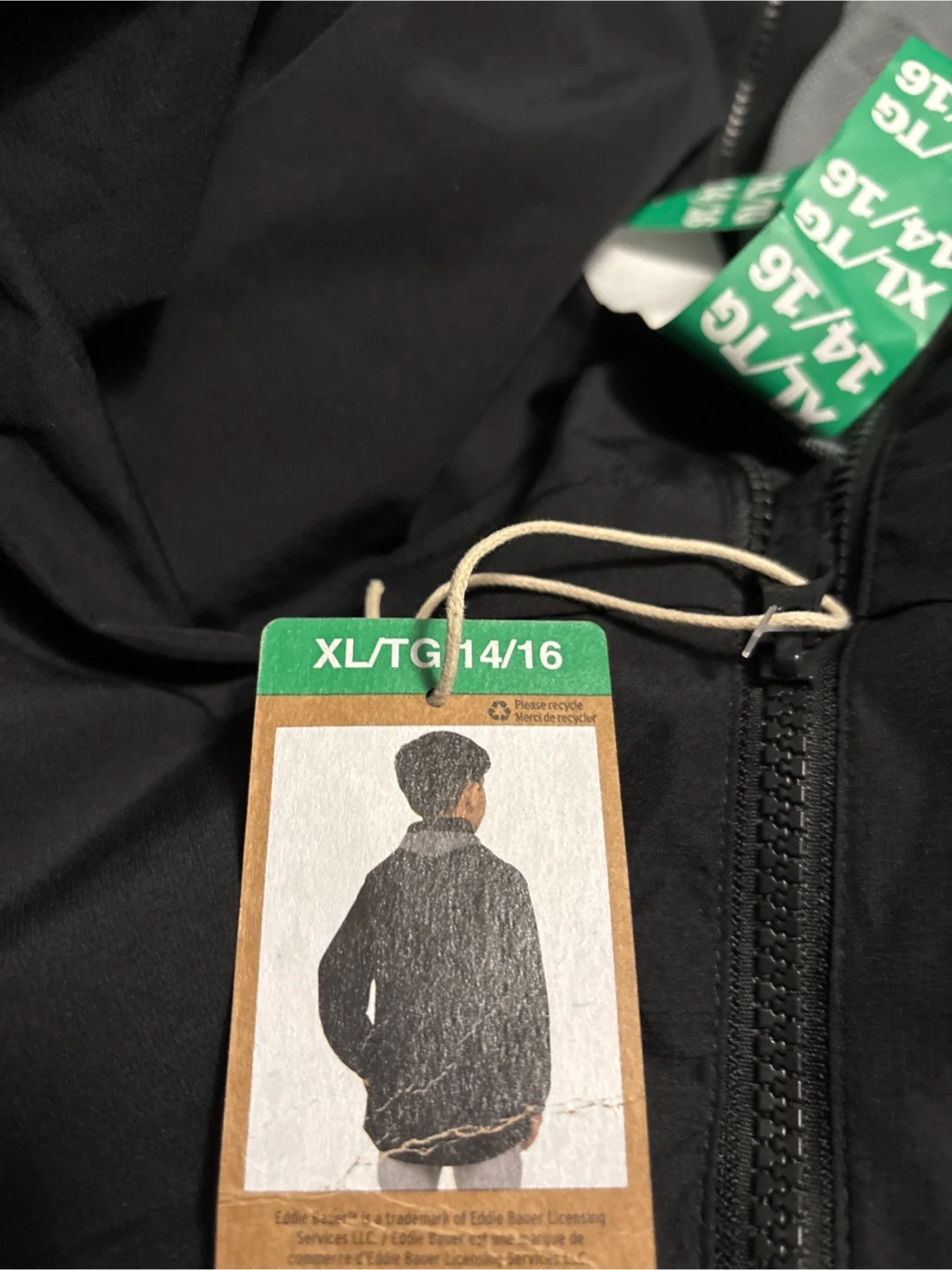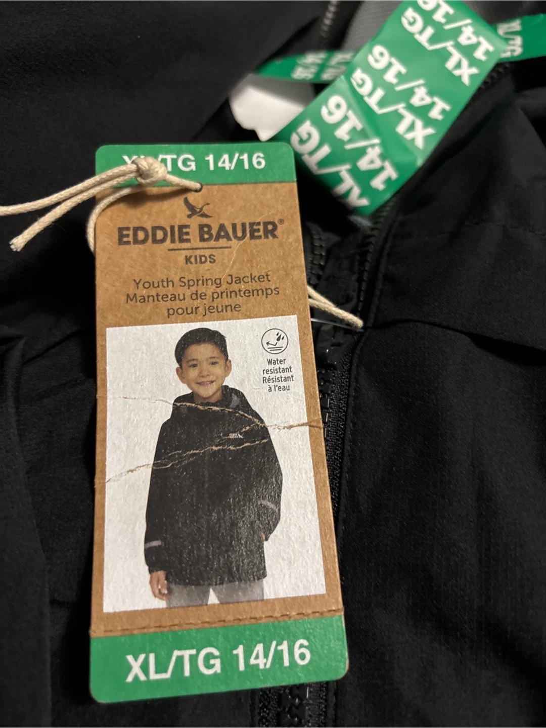 I'm selling a brand new Eddie Bauer Youth Spring Jacket in size XL (14/16)! It's black and water resistant, perfect for the spring weather. The jacket is designed for youth and is in excellent condition, never been worn. It comes from a smoke-free home