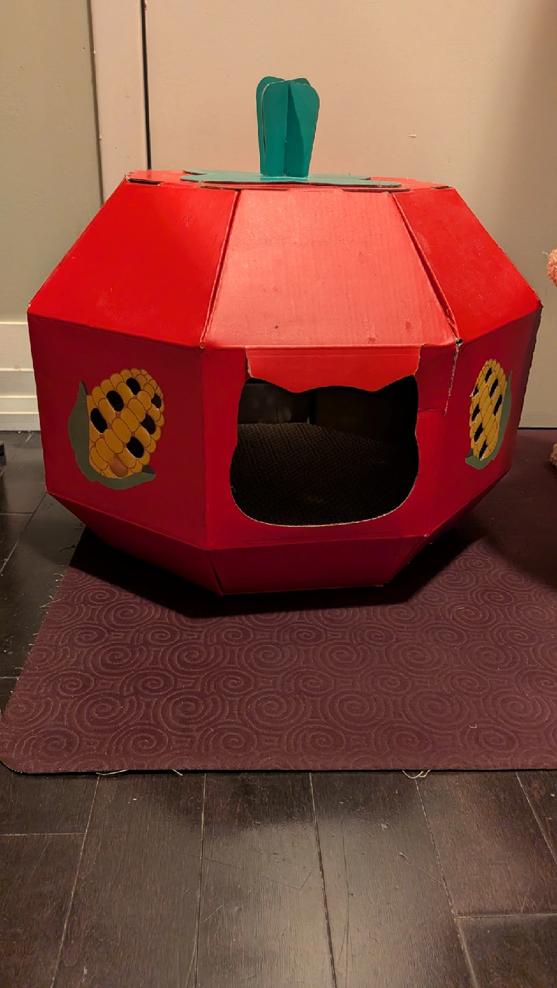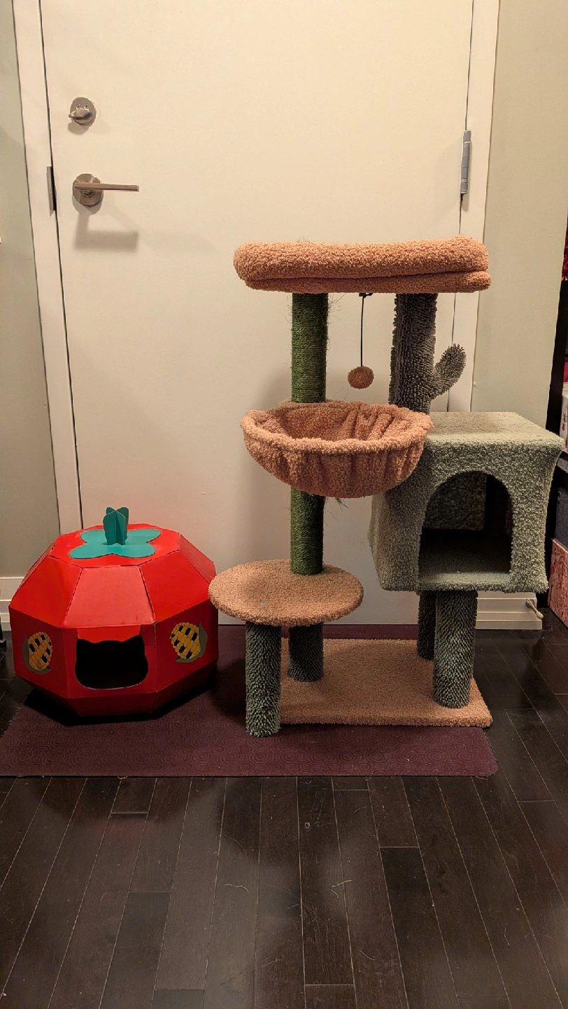 Selling a cat cave and a cat tree. The cat cave is red and shaped like a tomato. The cat tree is green, grey, and peach coloured. Issues with one post losing rope, see pic