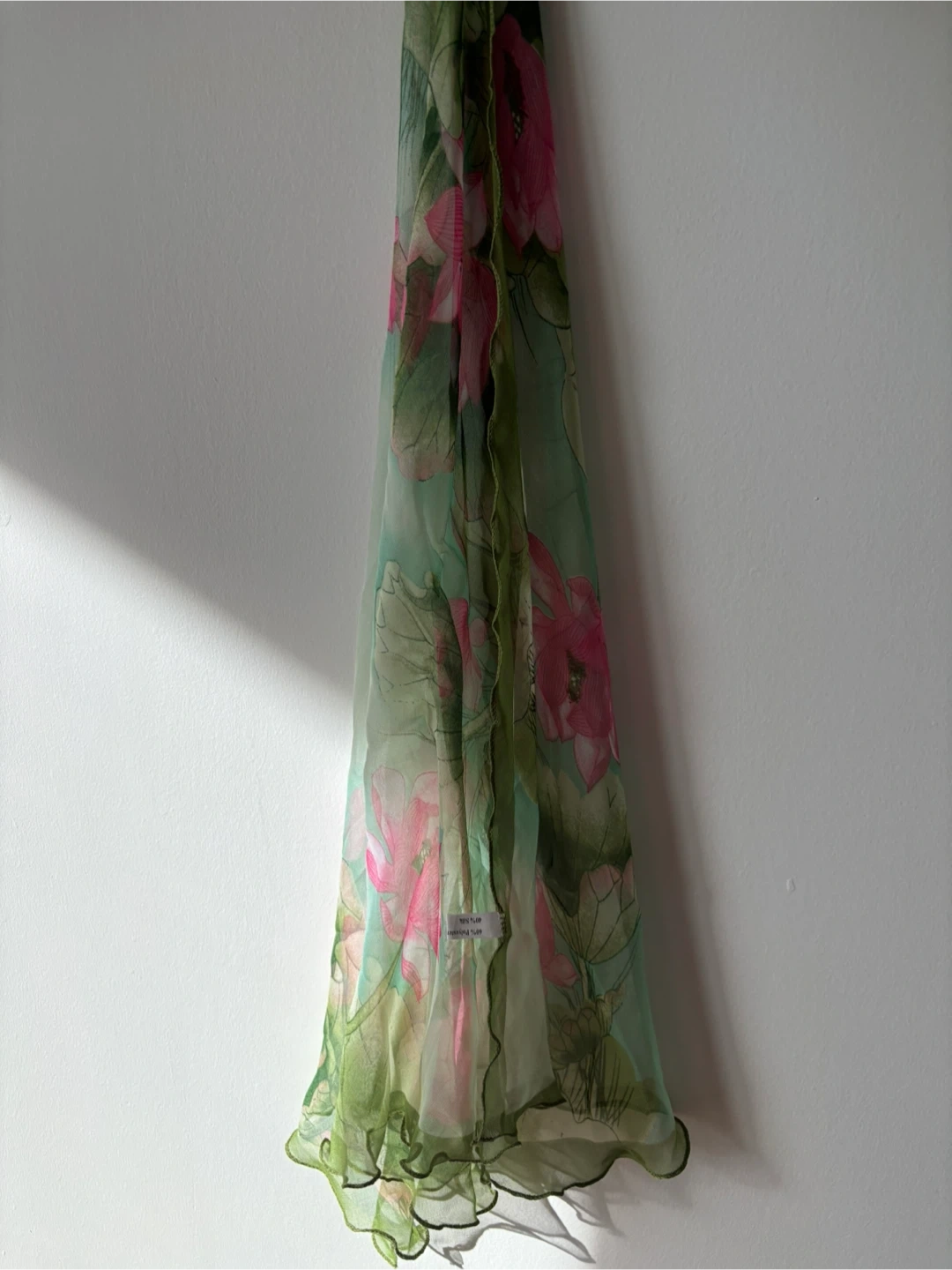 Beautiful floral scarf featuring a lovely green and pink pattern! It's in great condition and would make a stylish addition to any outfit