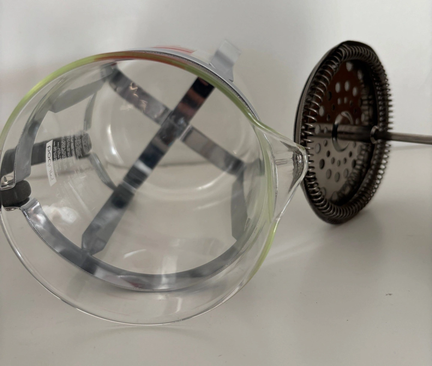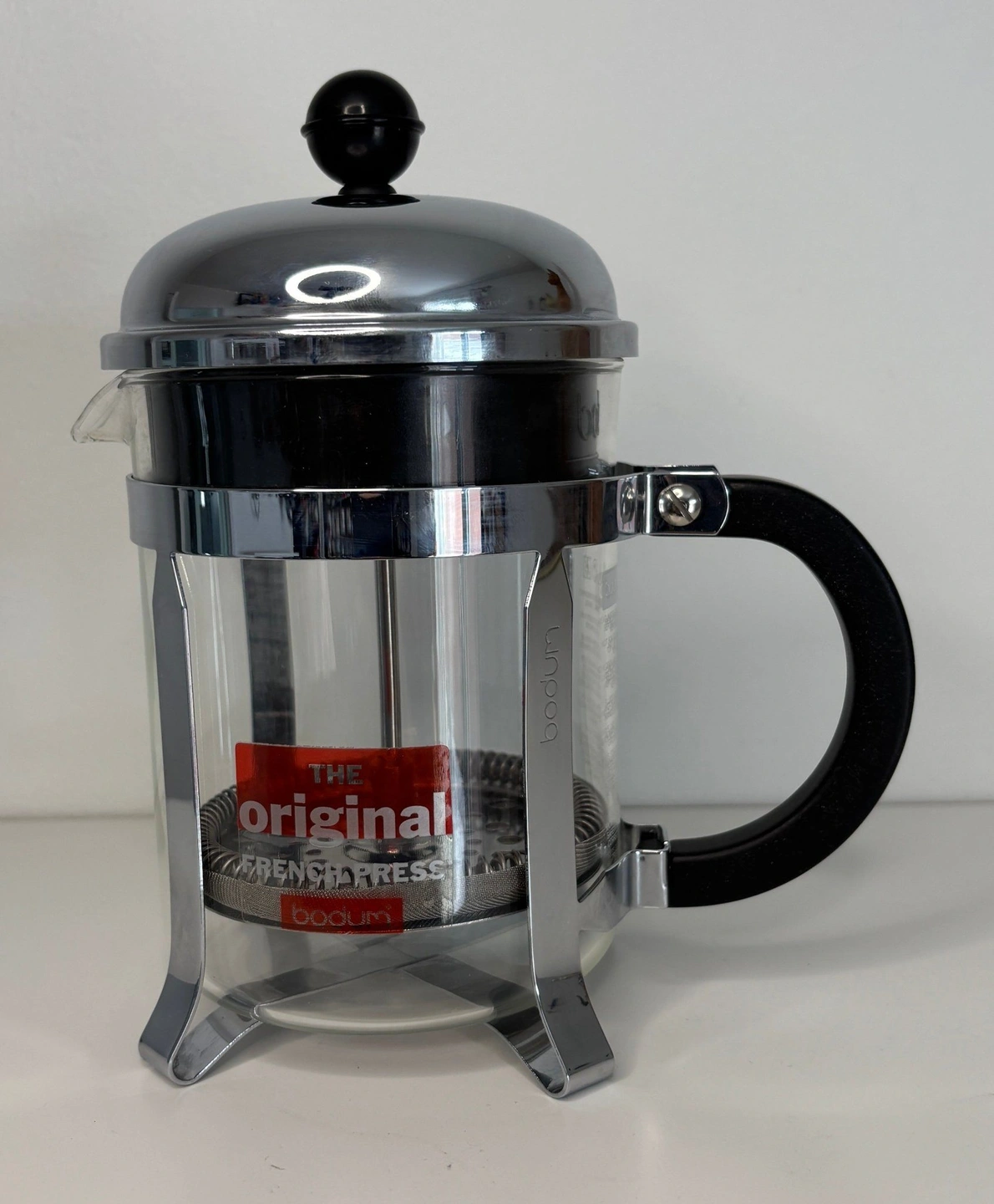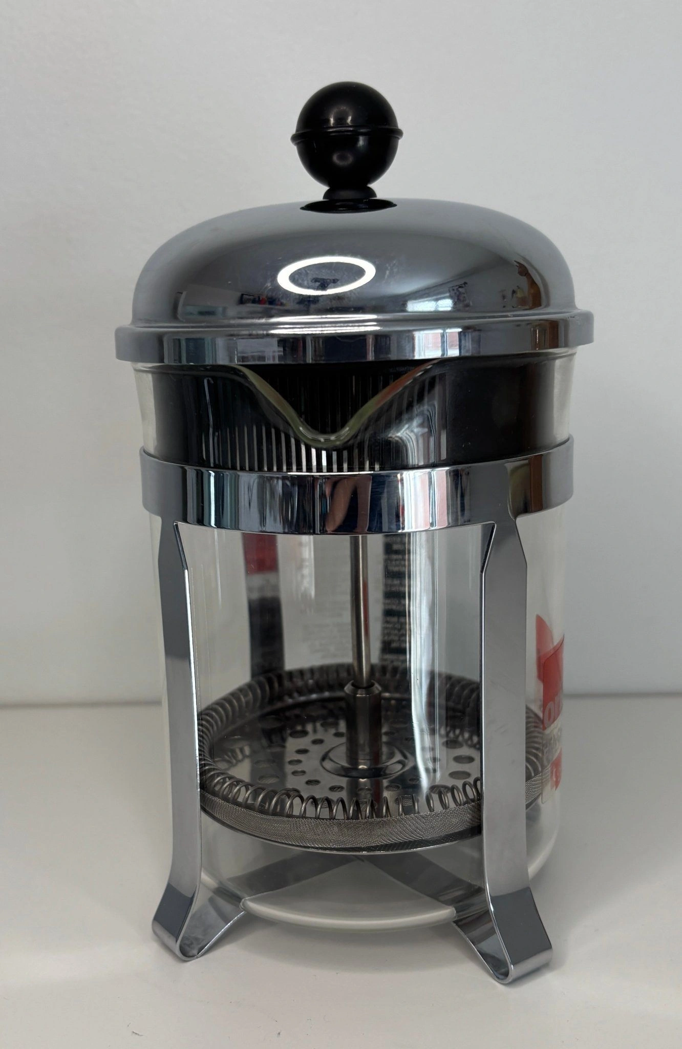 Showcase your art for brewing your favorite coffee blend with the Bodum 4 Cup French Press. A sleek, practical and efficient coffee maker, this Bodum French press is designed for coffee lovers who appreciate and deserve rich, full bodied coffee. Made from durable borosilicate glass and featuring a stainless steel frame, this French press is stylish and with the 4 cup capacity is perfect for personal use or sharing coffee with a friend. The stainless steel plunger and fine mesh filter ensure a smooth brew, free from coffee grounds, allowing the natural flavor and aroma of your coffee to permeate through. Easy to use and clean, the Bodum French Press is an eco friendly alternative to single use coffee pods, making it a great addition to you kitchen and coffee service. This Bodum 4 Cup French Press measures approximately 7 inches in total height and holds 4 fluid cups. Add this stunning Bodum 4 Cup French Press to your home and appreciate the time you have sharing your favorite brew with your favorite someone. Local pickup is in Etobicoke near Islington and The Westway. We offer shipping and local delivery for this item. Please send a message about availability and cost associated with these respective services.
