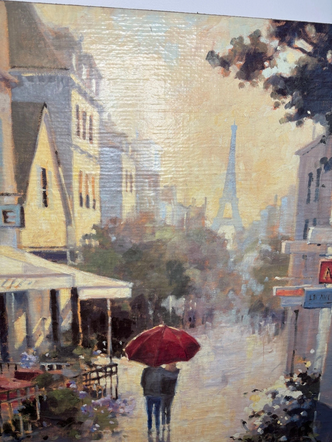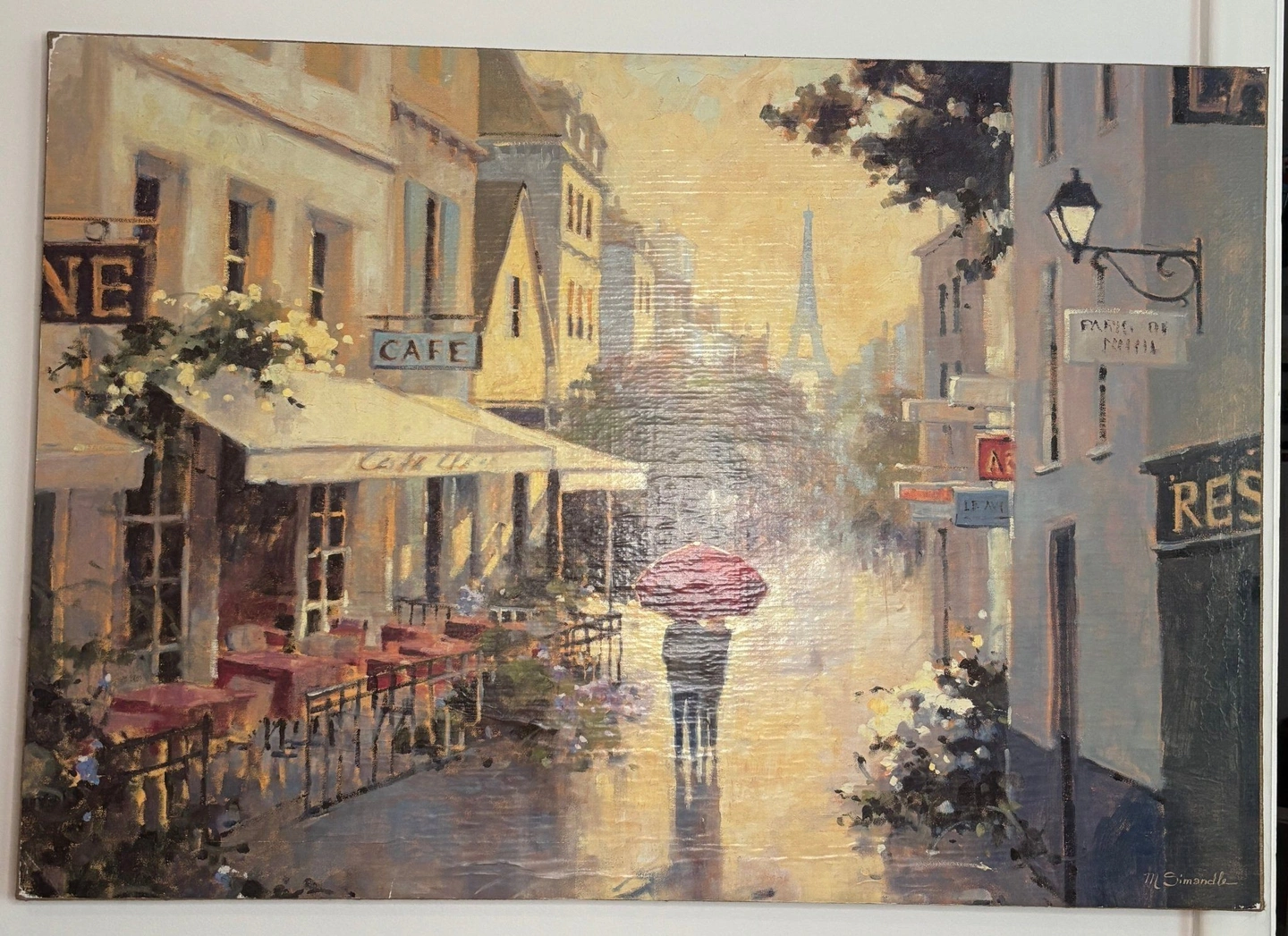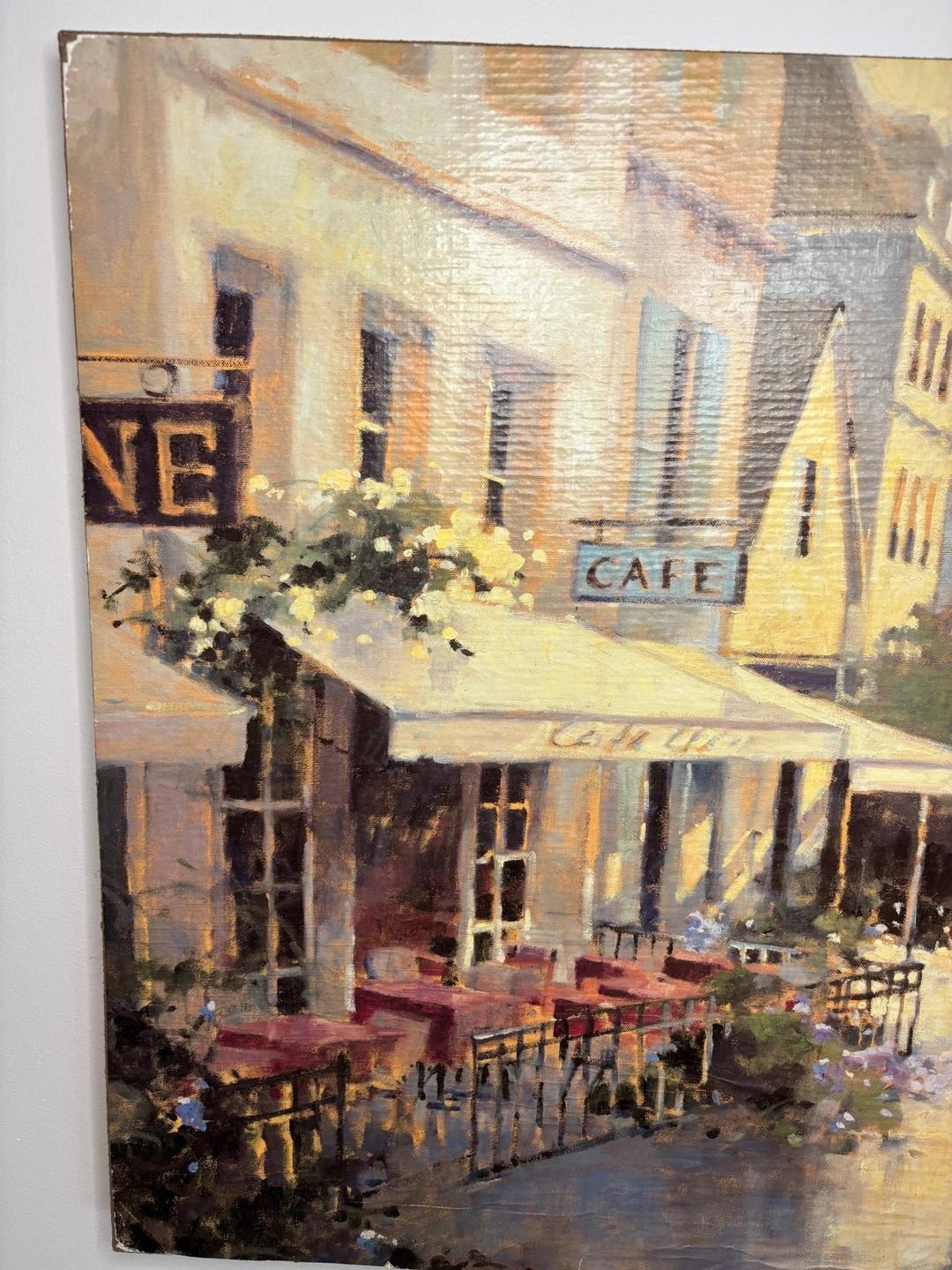 Collect and add some charm and elegance to an space in your home or office with this Marilyn Simandle’s Café de Ville Fine Art on Canvas Painting. This exquisite piece showcases Simandle’s signature impressionistic style that captures the rustic warmth and vibrancy of a classic European café street scene. With a blend of both subtle and rich colors, soft lighting, and expressive brushstrokes, this Simandle artwork brings a sense of romance and nostalgia to any space. Printed on canvas, this fine art piece is perfect for collectors and décor enthusiasts looking to add a touch of sophistication to their home or office without having to spend on an original oil painting. This unframed Marilyn Simandle Cafe de Ville Fine Art on Canvas Painting measures approximately 39 inches or 100cm long and 27 inches or 69cm tall. Provide the perfect painting for your space to enhance and enrich your home and collection with this stunning Marilyn Simandle Cafe de Ville Fine Art on Canvas Painting. Marilyn Simandle Cafe de Ville Fine Art on Canvas Painting. Local pickup is in Etobicoke near Islington and The Westway. We offer shipping and local delivery for this item. Please send a message about availability and cost associated with these respective services.