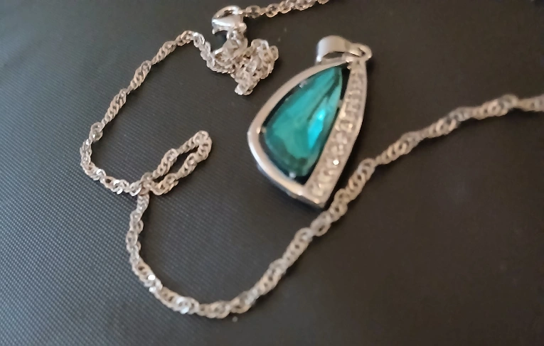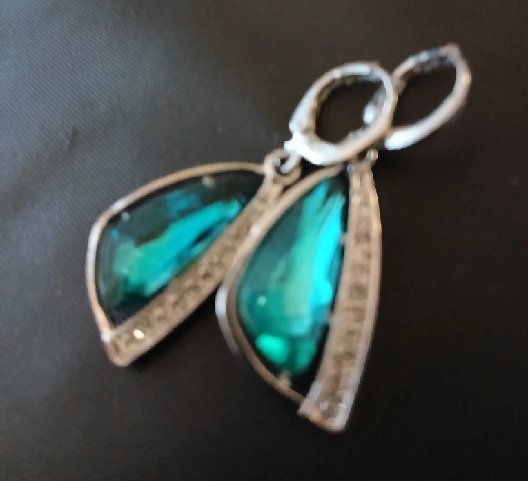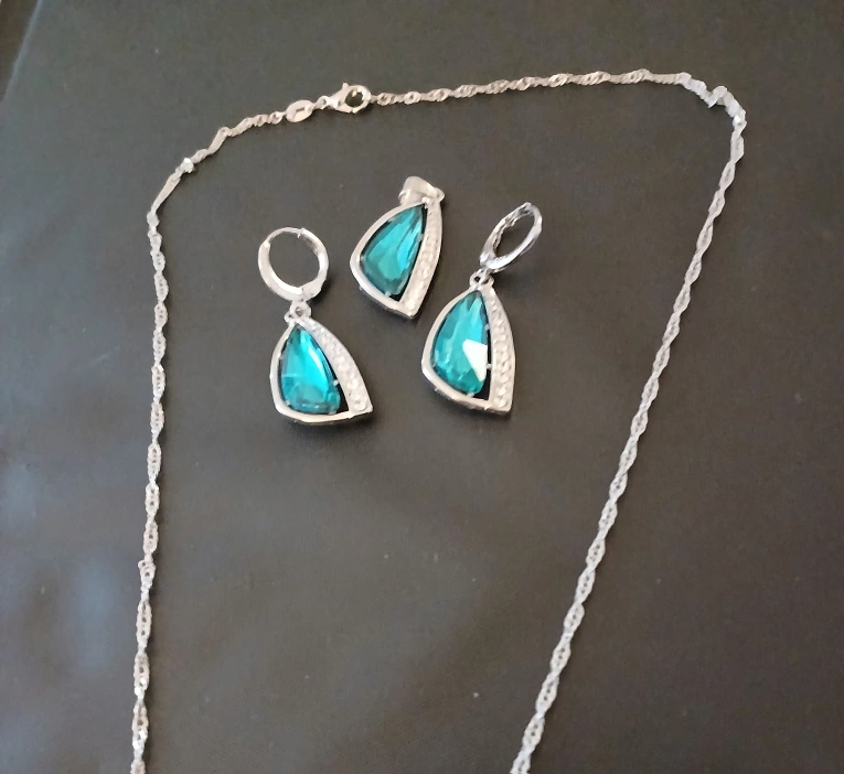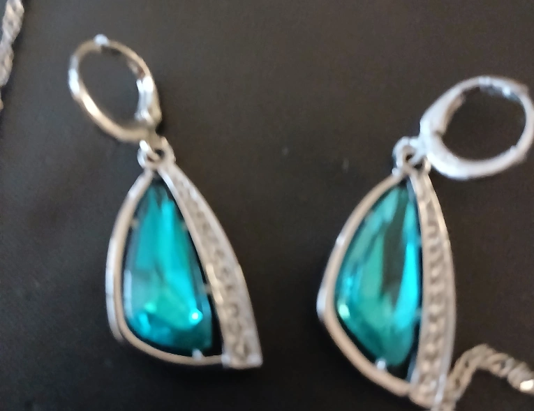 Selling a lovely set of earrings and a pendant. The set features a beautiful teal-coloured stone in a teardrop shape, surrounded by smaller clear stones.