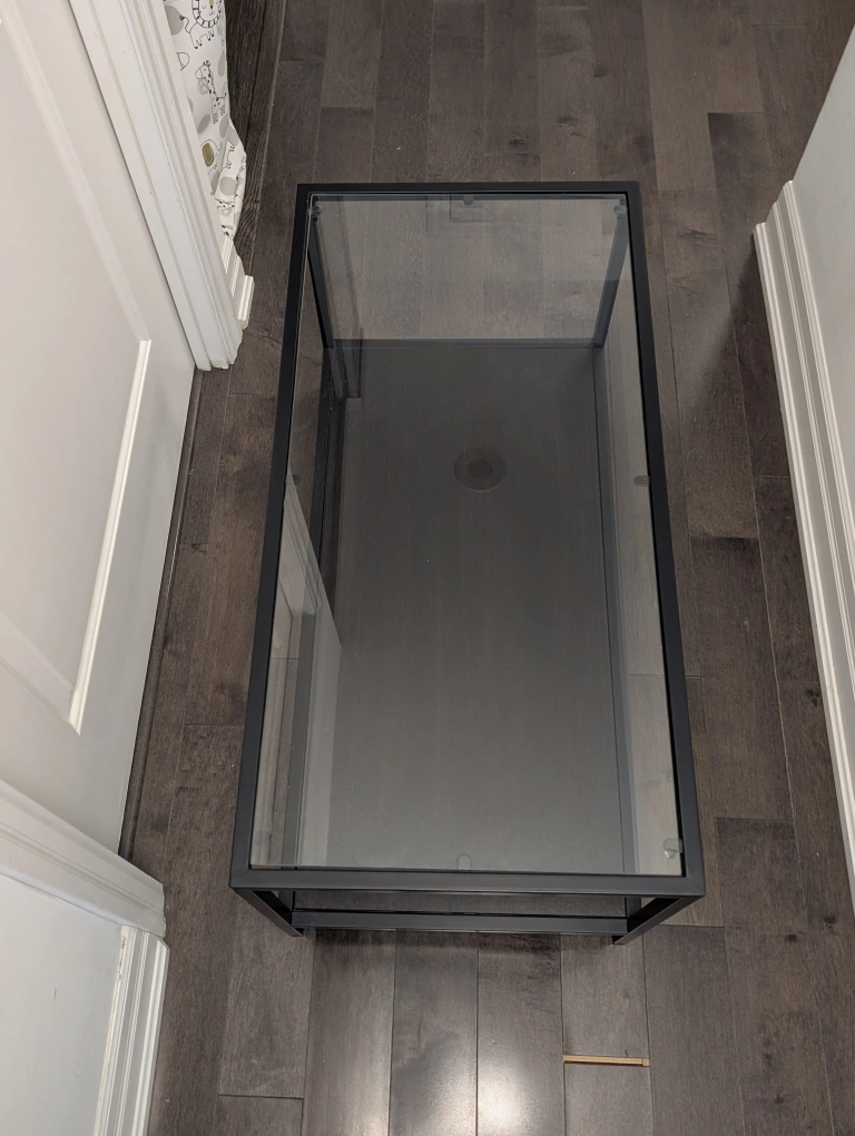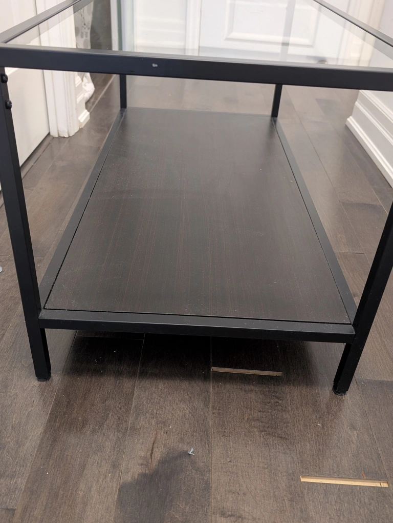 Selling a coffee table with a glass top and a sleek black frame. It has a modern look that would fit well in any living room. The table also features a lower shelf for extra storage or decor