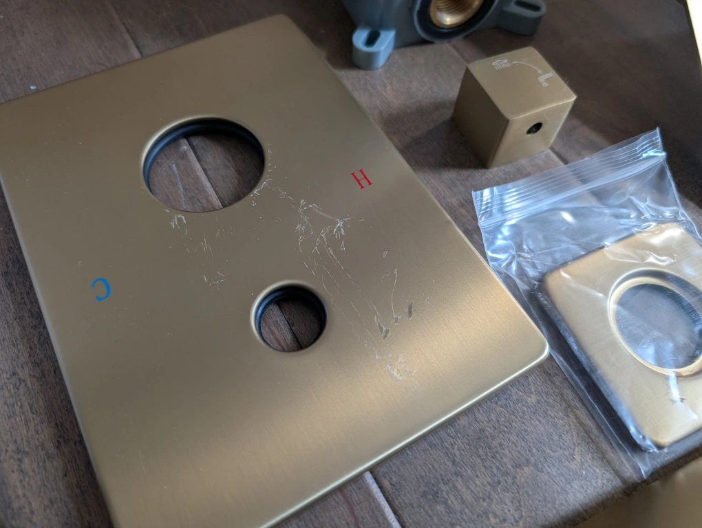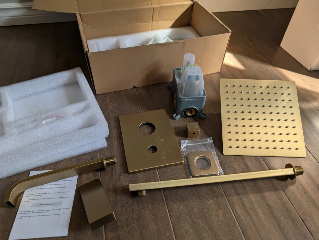 Brand new brushed gold square showerhead and tub faucet kit for sale. 8” inch rainfall shower head, 16” inch long shower head arm, bathtub tub spout, rough in valve, waterfall, solid brass, pressure balancing shower mixer valve, full kit with everything needed, cover plate has some scratches. $60 FIRM. Shower, Bathroom, Bath, Tub, Reno, Bathtub, Water, Tower, Massage, Rainfall, Waterfall, Jets, LED, Lights, Column, Valve, Wand, Spray, Renovation, Temperature, Pressure, Balanced, kit, system, trim