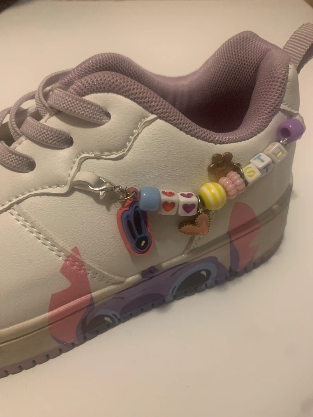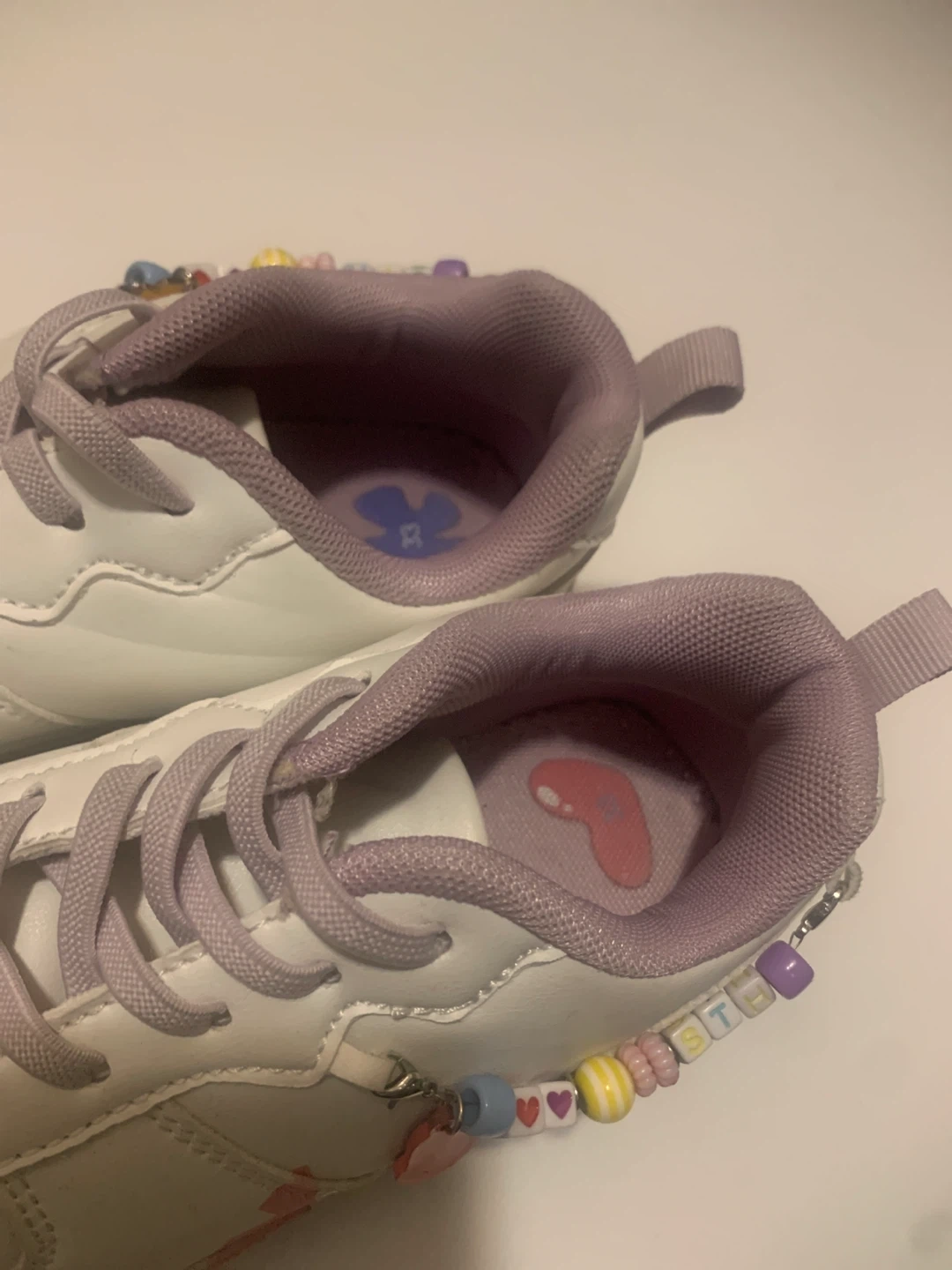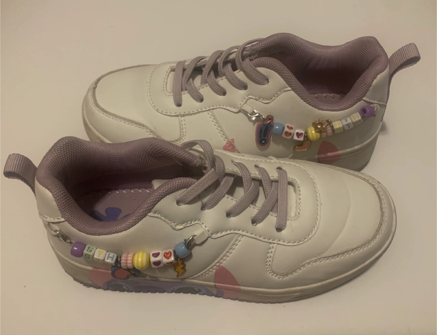 These are a pair of white sneakers with beaded charms details. Size 33. They're a unique and fun way to express your personal style! The sneakers are in good condition and ready for a new home. They feature light purple laces and interior lining.
