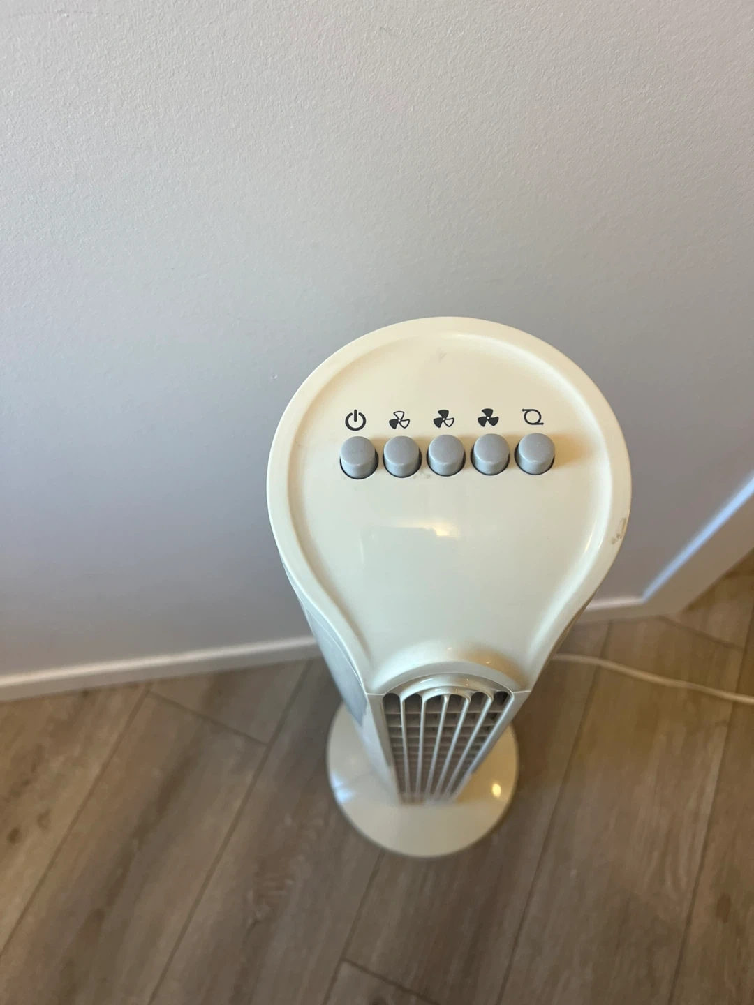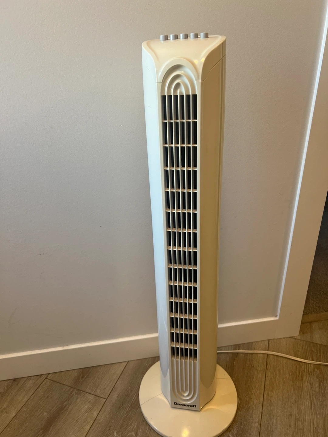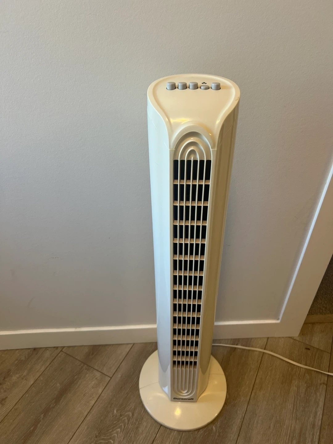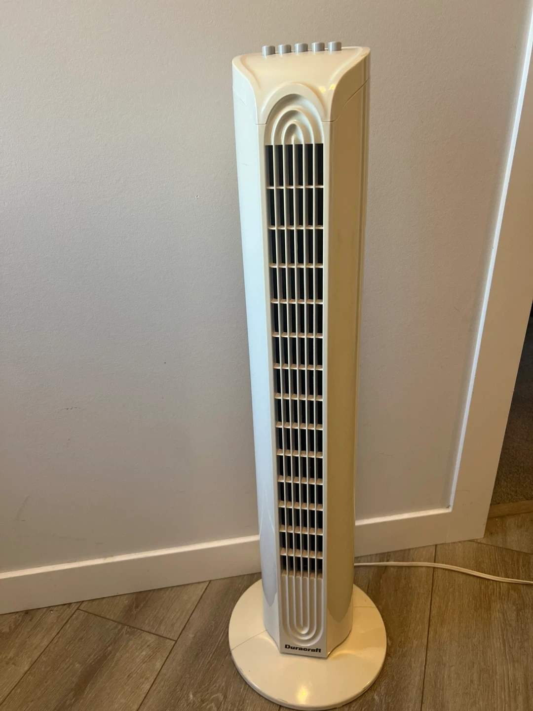 Selling a DuraCraft tower fan in white. It's in good condition and perfect for keeping cool during the summer months! Has different speed settings.