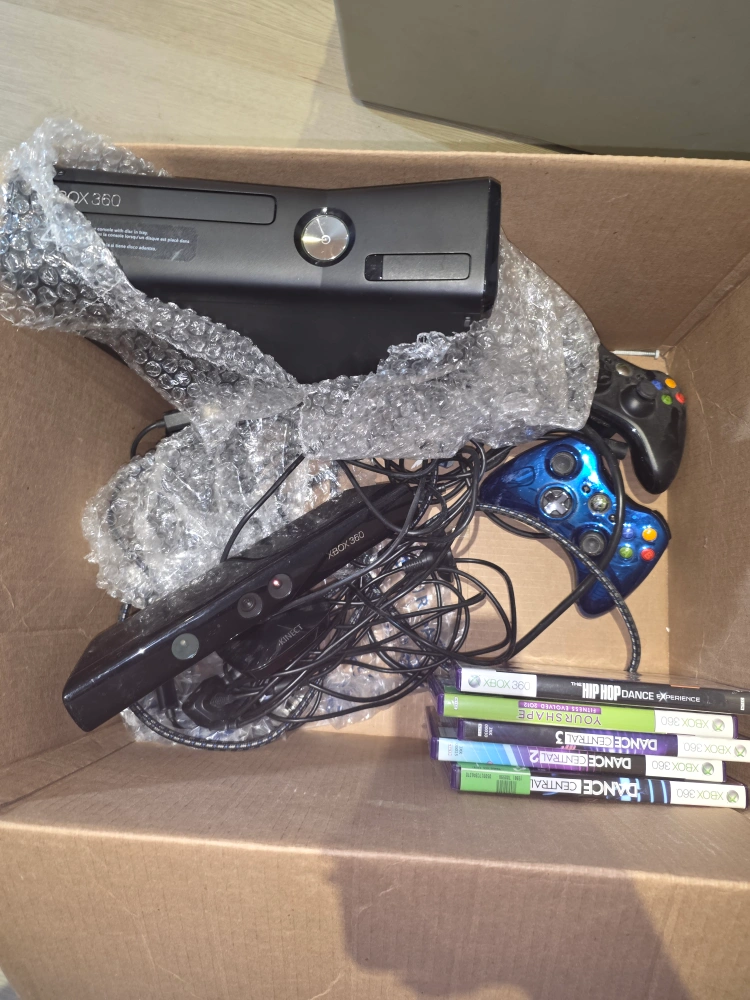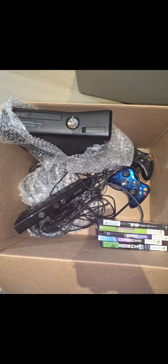 Selling an Xbox 360 console in good condition, along with a Kinect sensor and a selection of games. Includes two controllers. Ready for some retro gaming fun!