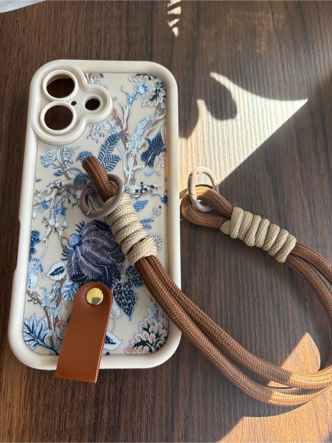 Selling a cute iPhone case with a floral design! It comes with a brown strap, perfect for keeping your phone secure and adding a touch of style. The case is in great condition and ready for a new home