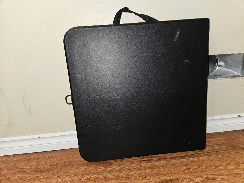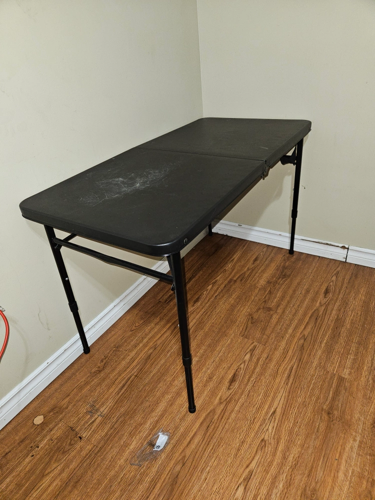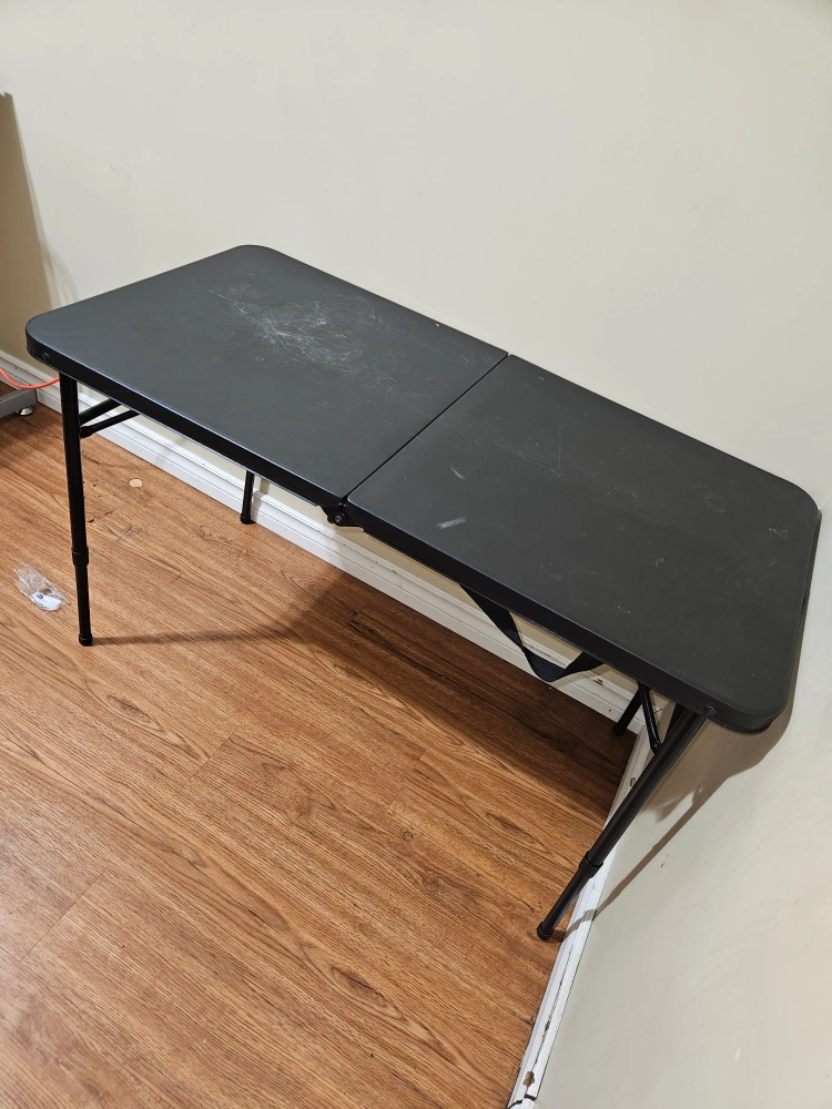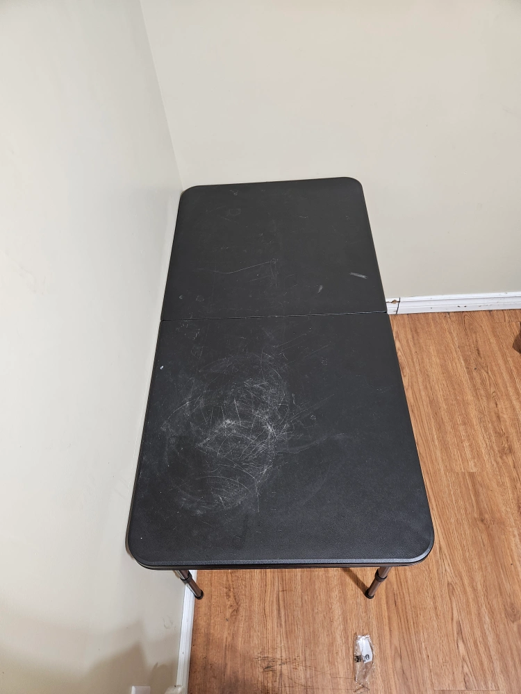 Black folding table in used condition. It's perfect for small spaces and easy to store when not in use. There are some scratches on the surface, but it's still sturdy and functional
