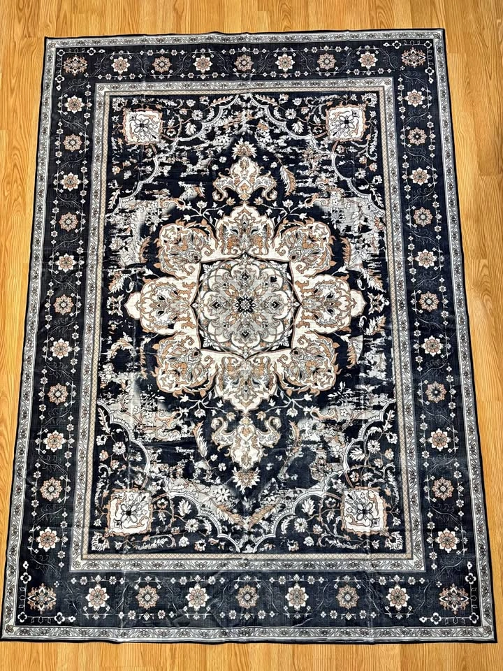 Brand new 5x7 area rug. This stylish soft area rug with lovely floral design in multi colors of navy blue, black, grey and golden colors. Non slip, machine washable and easy to clean. Perfect for living room, bedroom, dining room, home office and more. Pick up in NW. Pet and smoke free home. *Size: 5x7 ft *Color/Pattern: Navy Blue, Black/Multi colors This style is also available in other sizes. Please check my other listings for more options. 9x12 $145 8x10 $115 6x9 $85