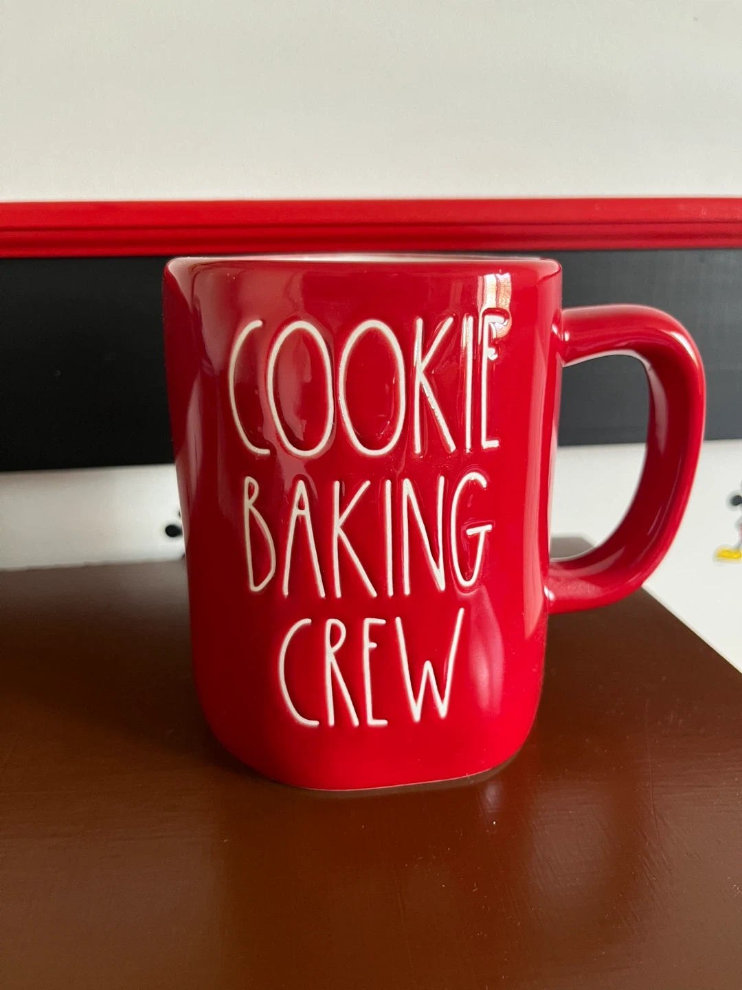 This is a Rae Dunn mug. It's red and says "Cookie Baking Crew" on the front. It's in great condition and ready for your favourite warm beverage