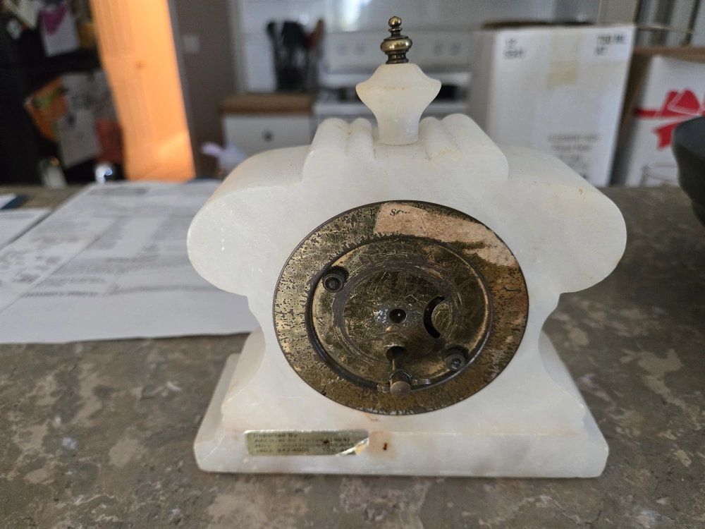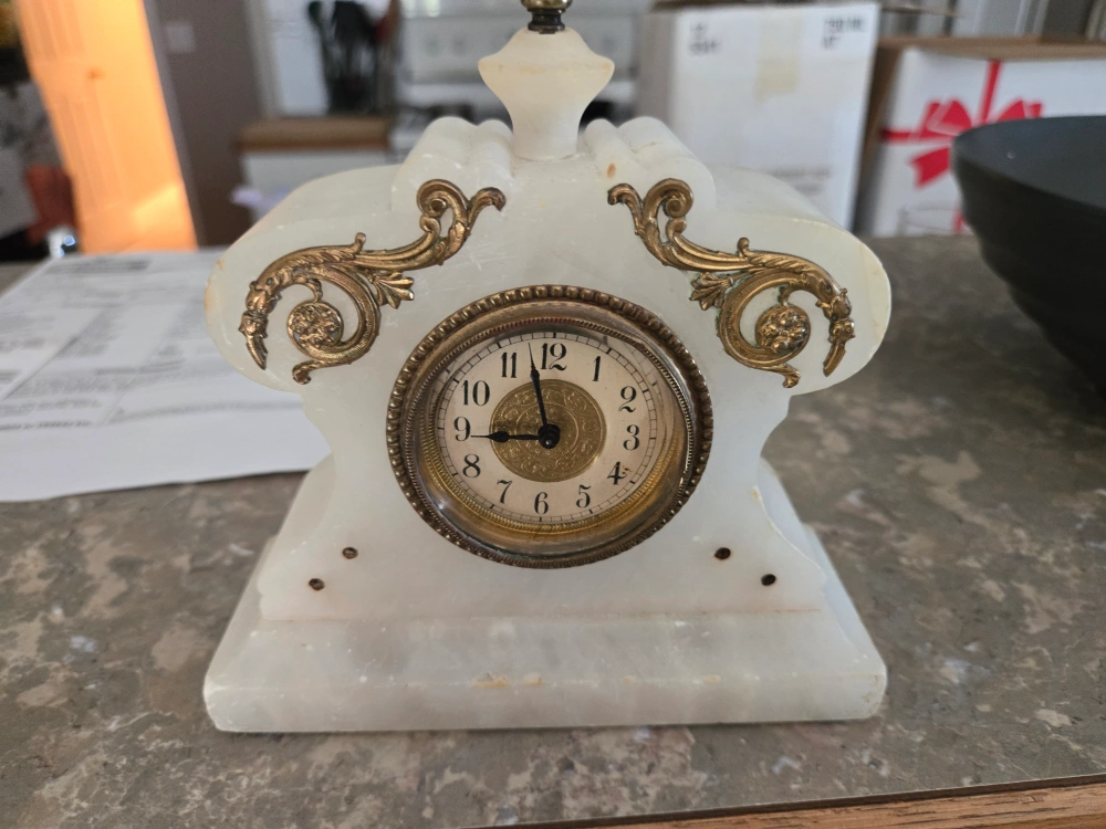 Selling a beautiful vintage marble mantle clock. It has ornate gold-toned detailing around the clock face, adding a touch of elegance to any room. The clock is in good condition and would make a lovely addition to your home decor