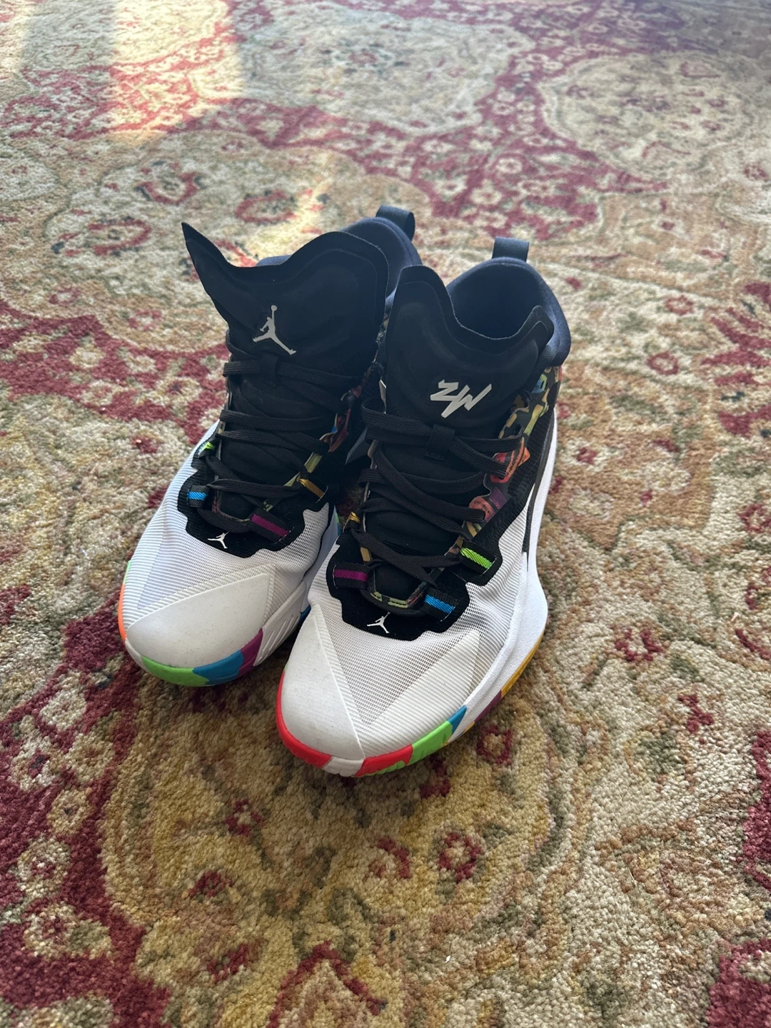 Size 11 Selling a pair of Jordan Zion 1 Z Code basketball shoes. They feature a white and black colour scheme with a colourful trim around the sole and laces. The shoes are in great condition and ready for the court or casual wear! First Jordan & Zion Williams collab shoe. Bought for my birthday years ago and only worn a few times. Great condition and looking for a new home.