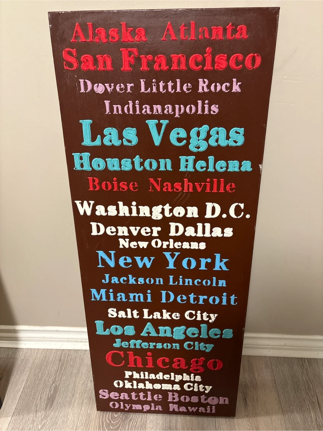 A fun sign featuring a list of cities! It includes Alaska, Atlanta, San Francisco, and many more. It's great for adding a bit of character to any room! Canvas frame pick up walnut grove Langley