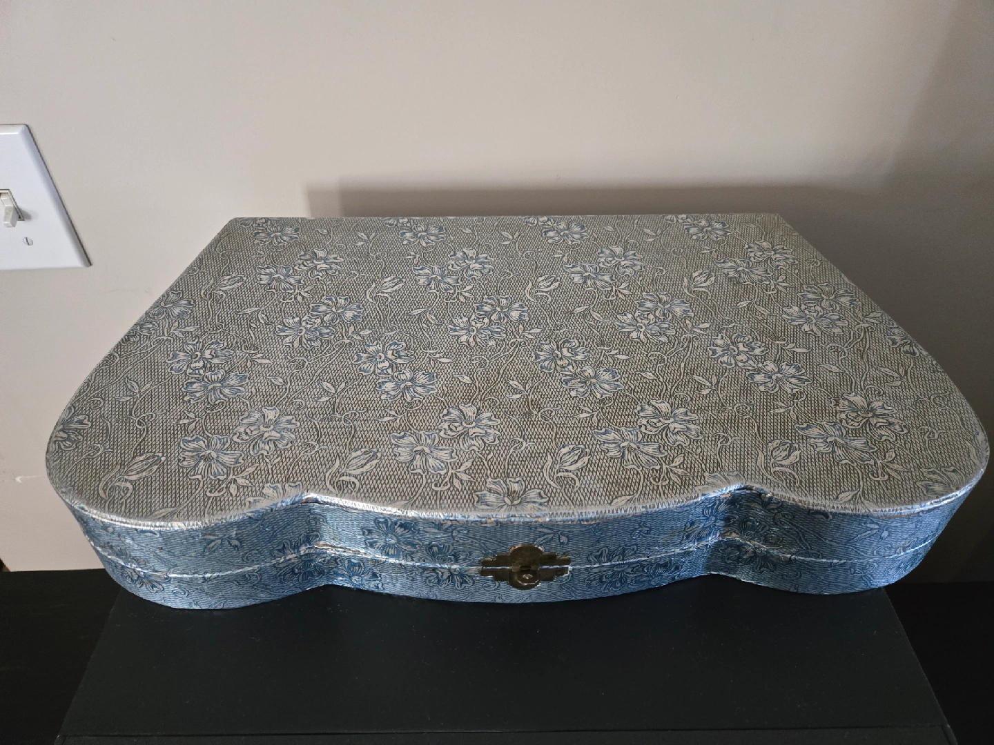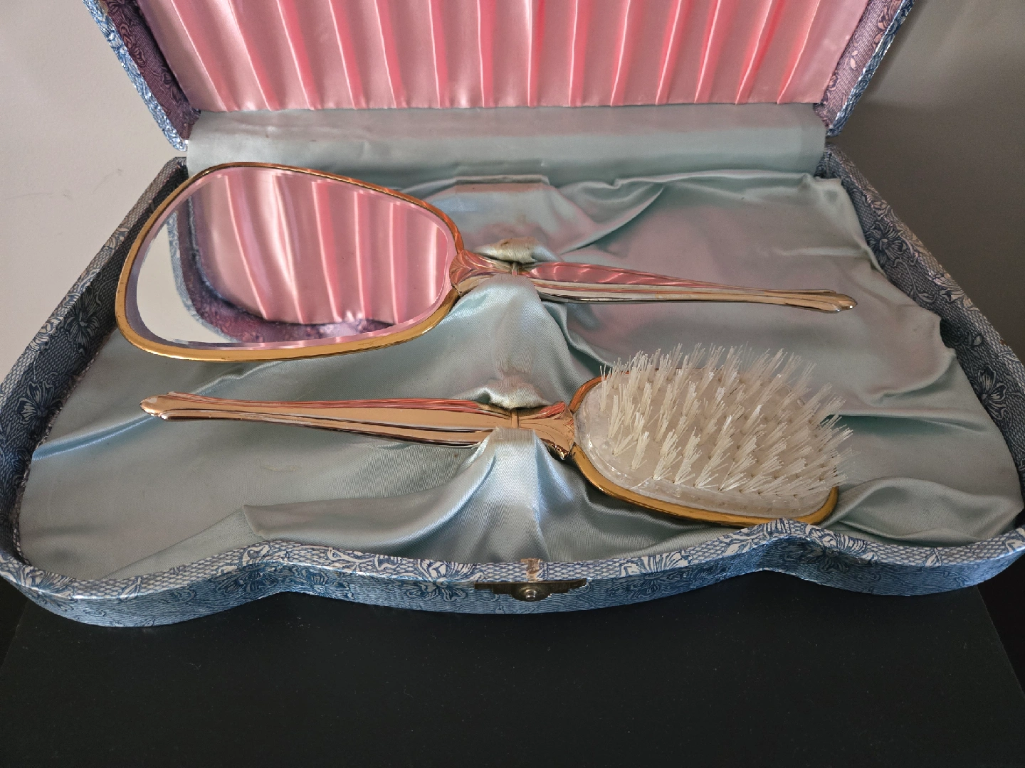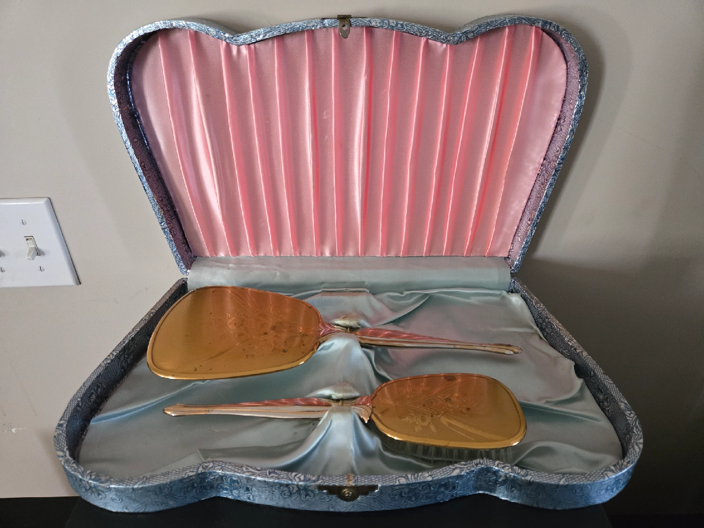 Selling a vintage vanity set that includes a hand mirror and hairbrush. The set comes in its original box, which has a lovely floral pattern. The mirror and brush have a gold finish, adding a touch of elegance to your vanity or dresser