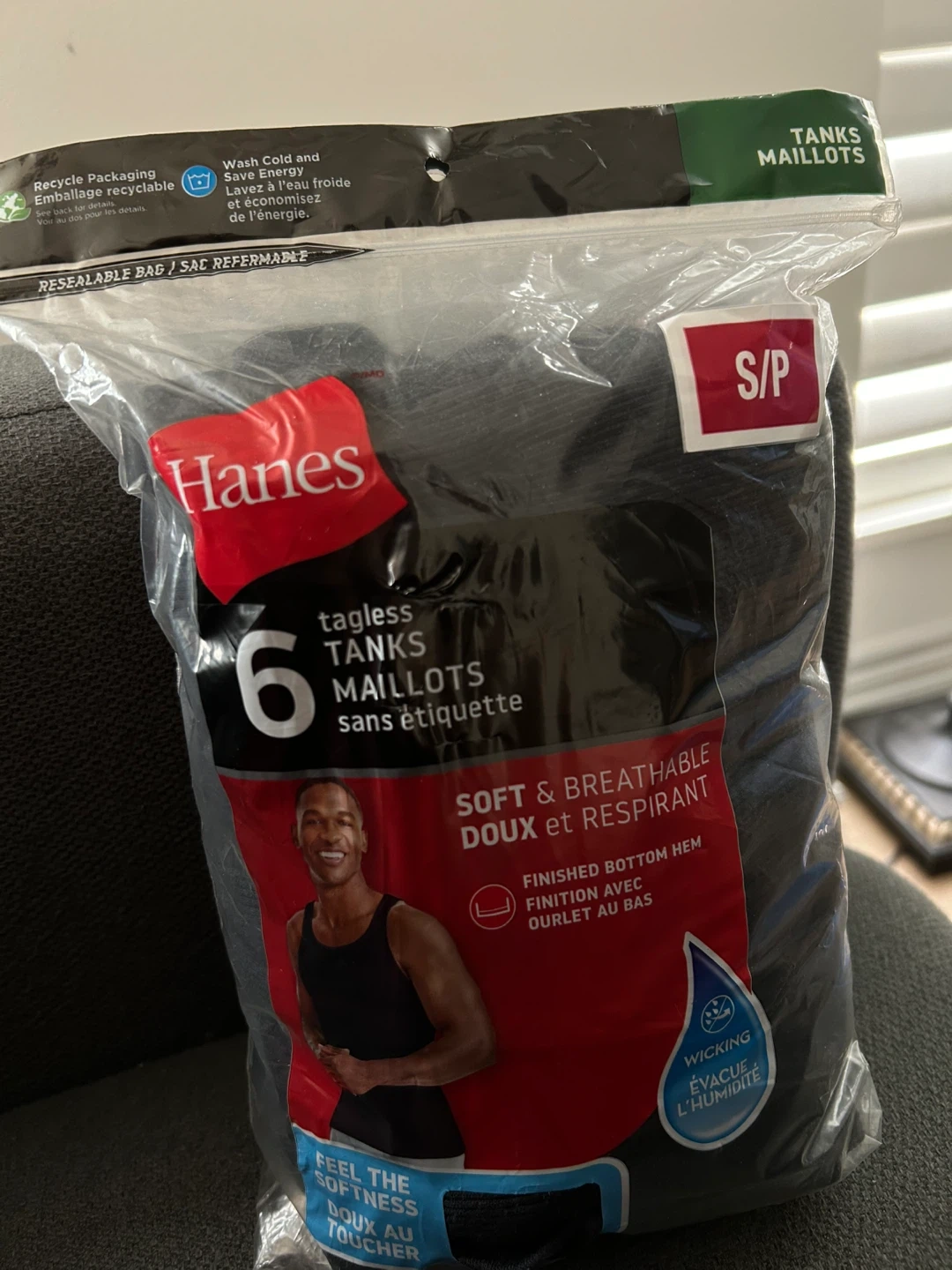 Selling a brand new pack of Hanes tagless tanks for men! This is a pack of 6, size S/P (Small/Petit). They are soft and breathable, with a finished bottom hem. Made of 100% cotton. Bought from Amazon