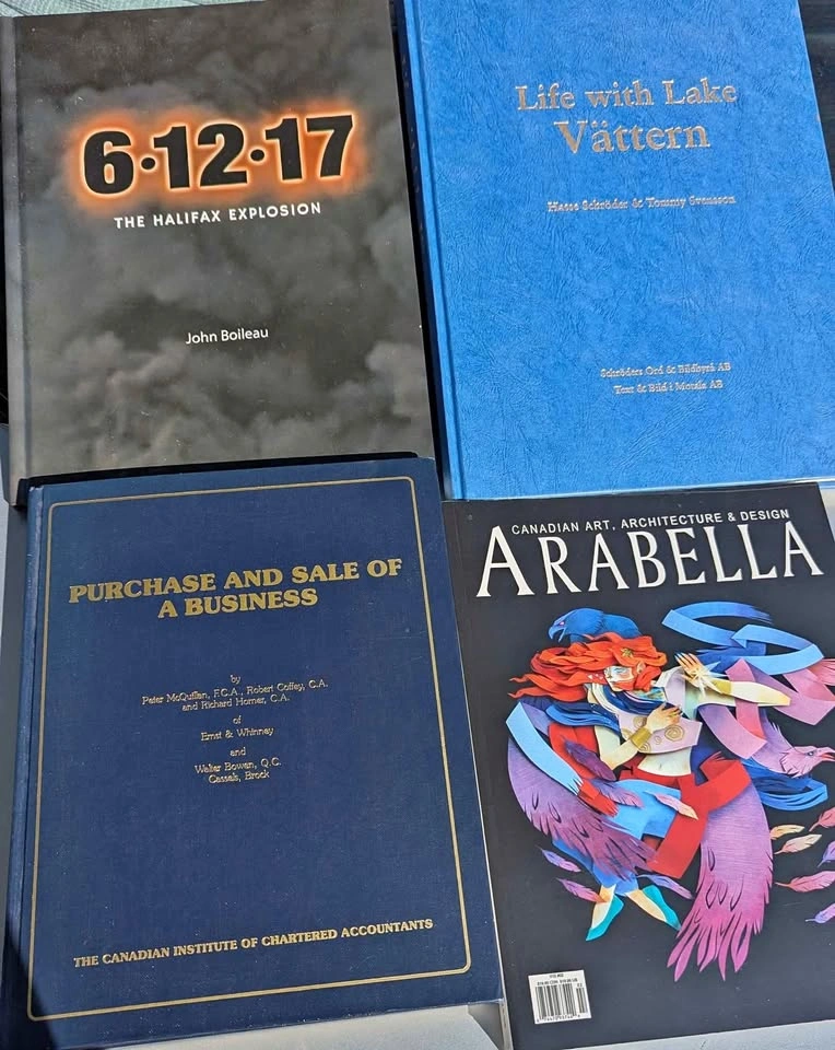 Set of 4 unique hardcover books, each with its own story and collectible appeal: 📘 6•12•17: The Halifax Explosion (John Boileau, Nimbus, 2017) Centennial edition chronicling the 1917 Halifax disaster — detailed and beautifully produced. Excellent for Canadian history buffs or local collectors. 💙 Life with Lake Vättern A rare Swedish photography and nature book, elegantly bound with gold lettering. Perfect for coffee tables, libraries, or nature enthusiasts. 💼 Purchase and Sale of a Business A classic reference by The Canadian Institute of Chartered Accountants. Great for vintage office decor or collectors of finance and law editions. 🎨 Arabella: Canadian Art, Architecture & Design A glossy art magazine celebrating Canadian creativity. Features stunning visuals and contemporary artwork — ideal for inspiration or display. Condition: All in good to excellent shape. Clean interiors, crisp covers. $40 for the lot or $15/each