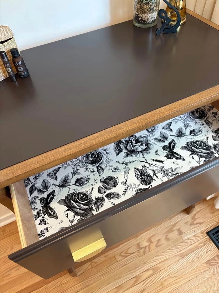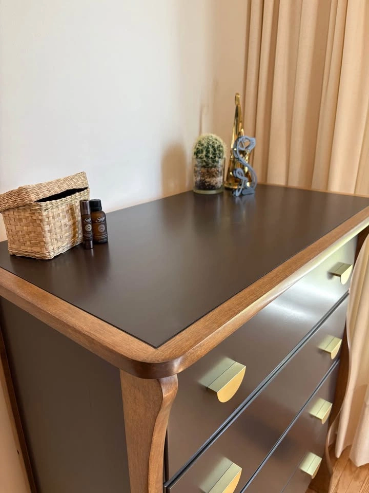 ✨Newly refinished & large drawer capacity✨ She’s got curves! I absolutely loved the curvy detail of the legs and had to put those curves on display by keeping them wood tone. Beautifully contrasts against the dark espresso brown of the body. And to keep the curves going, the half moon drawer pulls fit in wonderfully 🤎 This dresser is perfectly imperfect. She is ready to be used and appreciated. The 4 drawers have amazing storage capacity. Lots of hoodies and winter sweaters can fit in these for the colder months ahead. Brand Si Colour Espresso This bureau was completely sanded and stained on the exposed wood curves. Yes curves made the sanding extra fun 😅 Body was scuff sanded, primed and spray painted the rich brown. The whole thing was top coated multiple times for durability. Drawer stoppers/buffers were added to protect the paint when closing. Drawer liners were added though no perfect. Brand new gold hardware was added for final touches and voila! Dimensions 36” W 44” H 20.5” D Pickup around Bayly & Liverpool