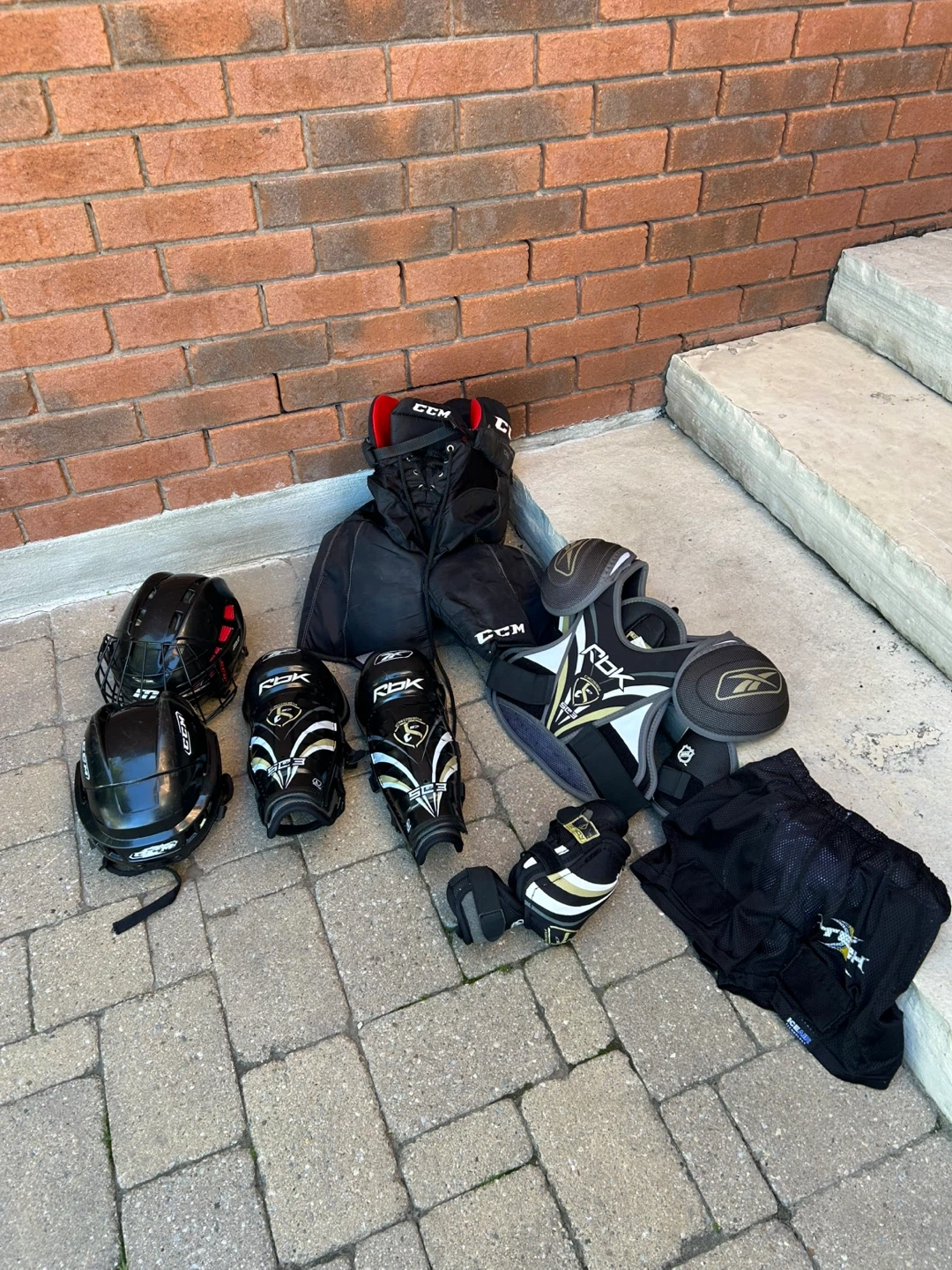Get ready to hit the ice with this collection of used hockey equipment, perfect for players looking for reliable gear, this set includes helmets, shoulder pads, shin guards, and protective under garments, all showing signs of use but ready for action on the rink. * Helmets * Shoulder Pads * Shin Guards * Protective Under Garments Why pay full price when you can gear up affordably? Prices for similar sets on Kijiji range from $75 to $200, I am pricing to sell. If the ad's still up, the gear's still available – let's get you game-ready!
