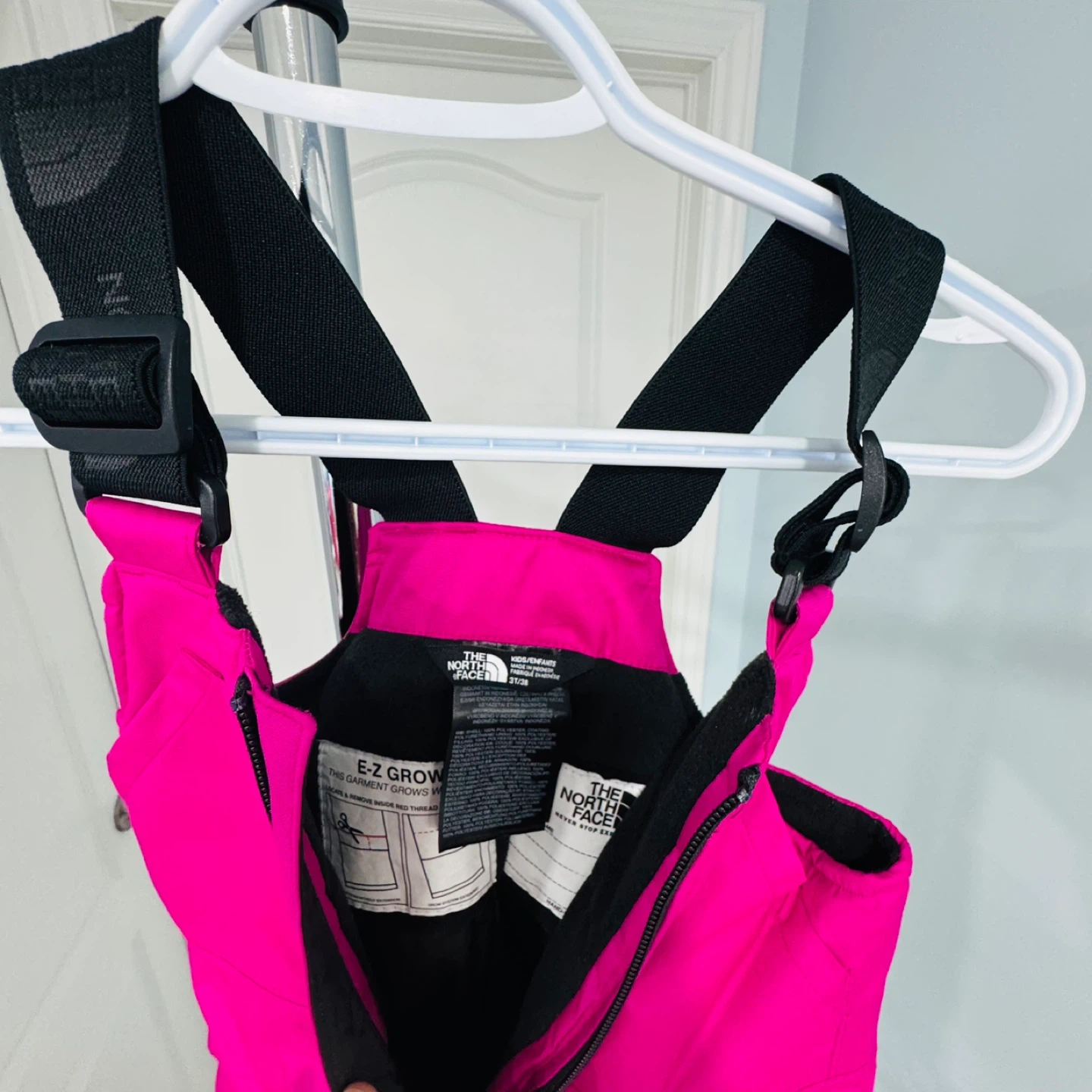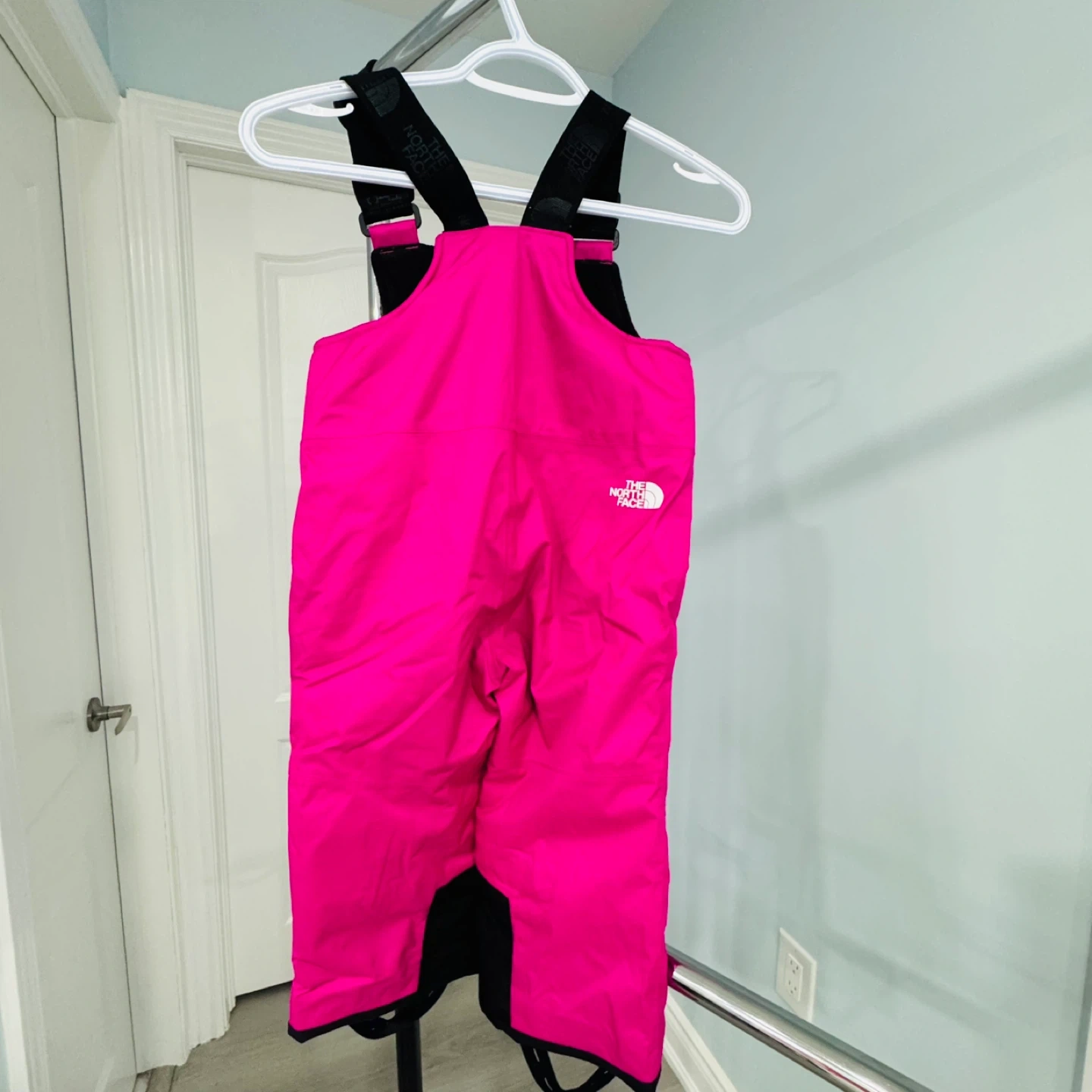 The North Face snow bibs in a vibrant pink color, size 3T and in great condition. Perfect for keeping your little one warm and dry during winter activities.