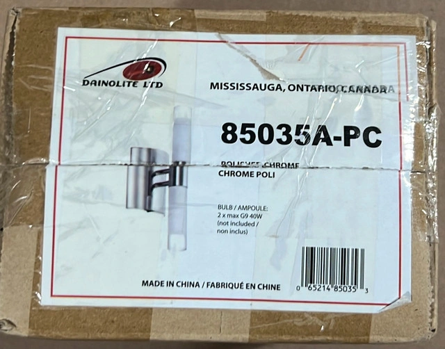 Illuminate your space with this new Dainolite Wall Sconce, model 85035A-PC, featuring a polished chrome finish and designed for two G9 40W bulbs (not included). * Brand: Dainolite * Model: 85035A-PC * Finish: Polished Chrome * Bulb Type: 2 x G9 40W (not included) Looking to add a touch of modern elegance to your bathroom or hallway? This sconce is the perfect choice!