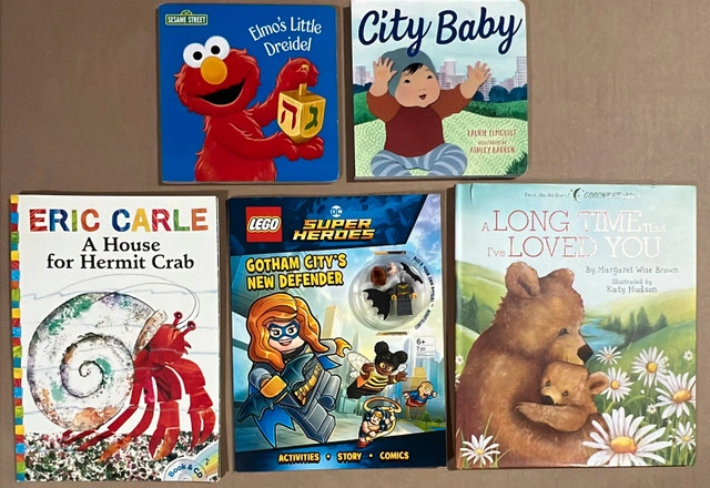 I'm offering a delightful collection of used children's books, perfect for young readers. This set includes titles such as 'Elmo's Little Dreidel', a charming board book, 'City Baby' with its sweet illustrations, Eric Carle's 'A House for Hermit Crab', a LEGO DC Super Heroes activity book, and 'A Long Time That I've Loved You'. These books are used but remain in good condition, ready to spark imagination and joy. * Elmo's Little Dreidel (Sesame Street board book) * City Baby (Illustrated children's book) * A House for Hermit Crab by Eric Carle * LEGO DC Super Heroes Gotham City's New Defender (Activity book with Minifigure) * A Long Time That I've Loved You by Margaret Wise Brown If the ad's up, the books are available!