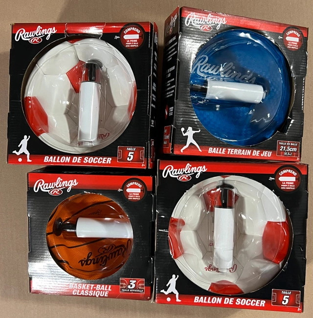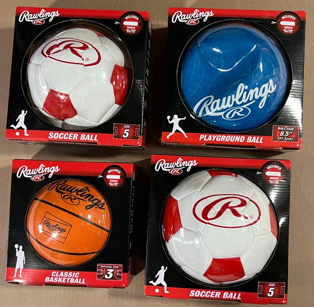 Get your game on with this set of four brand-new Rawlings sports balls, perfect for kids! This set includes two size 5 soccer balls, one official size 3 basketball, and one 8.5" playground ball. Each ball comes with its own inflation needle, ensuring they're always ready for action! Looking for a fun way to get the kids active? These Rawlings sports balls are just the ticket! And remember, if the ad is up, they're ready to go!