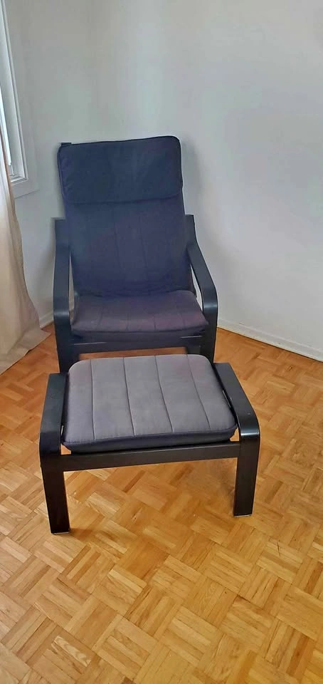 Includes: 1 chair + 1 matching ottoman Sturdy wooden frame (black finish) Comfortable cushioned seat and backrest Removable & washable covers Gently used, clean, and well-maintained No rips, stains, or damage Pickup Location: Craig Henry / Nepean, Ottawa