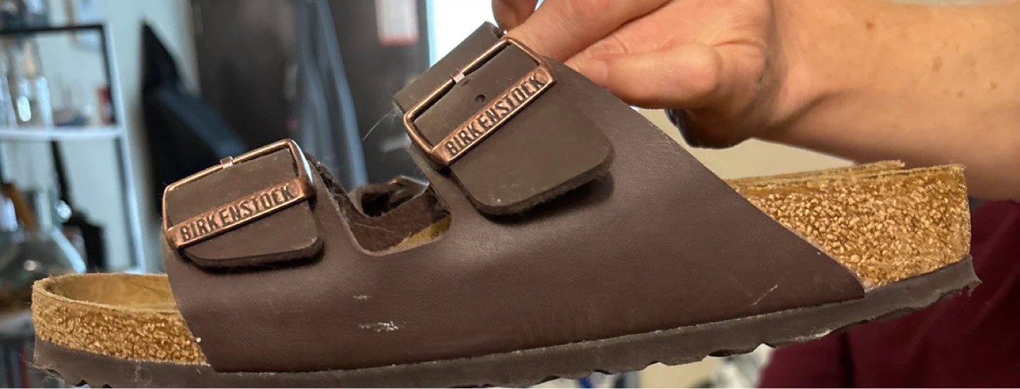 Must Go!-Selling a pair of Birkenstock Arizona sandals in size 38, which is about a US size 7 to 7.5. These are a dark brown colour with copper-toned buckles. They're in good condition and ready for a new home!