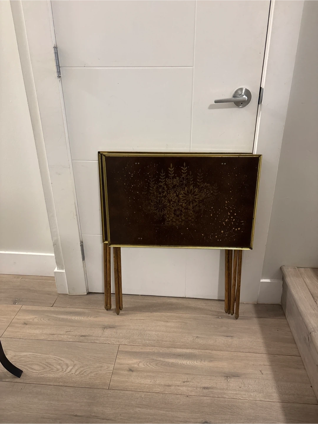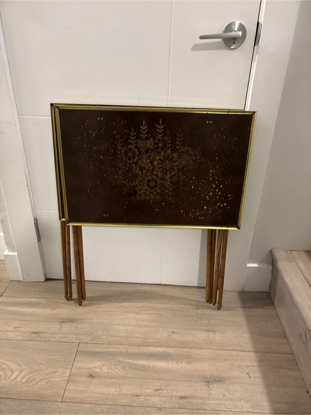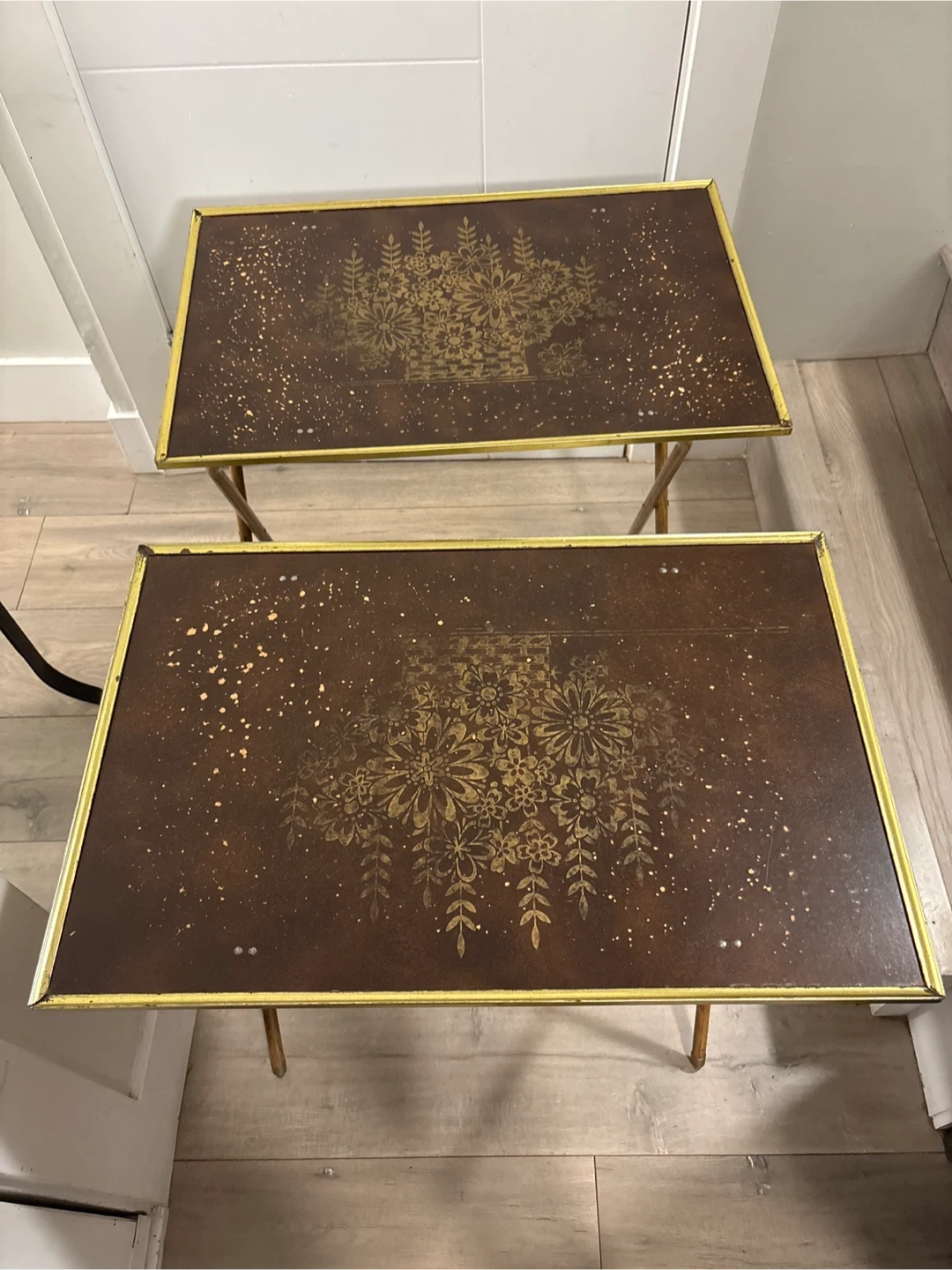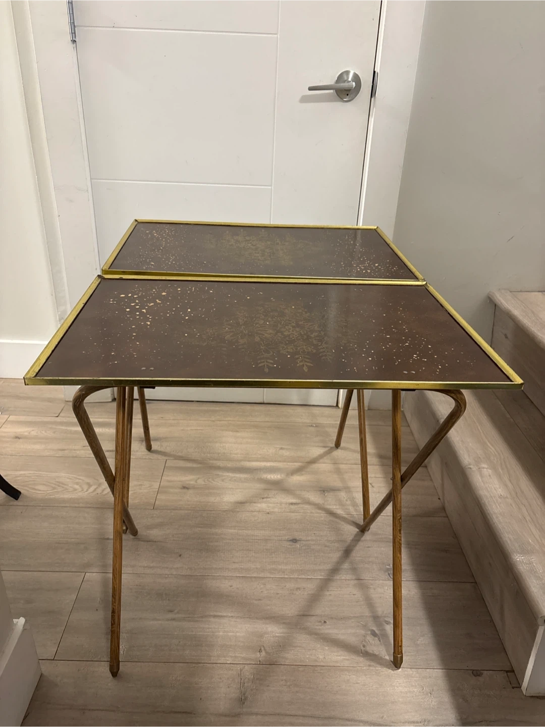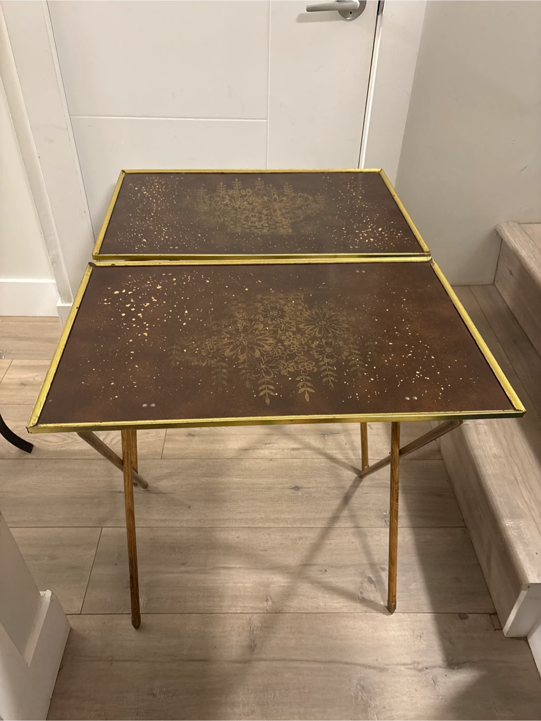 Selling a set of two vintage TV tray tables! They have a lovely brown and gold floral design on the top. Perfect for snacks, meals, or crafting while you're watching your favourite shows. They fold up easily for storage too