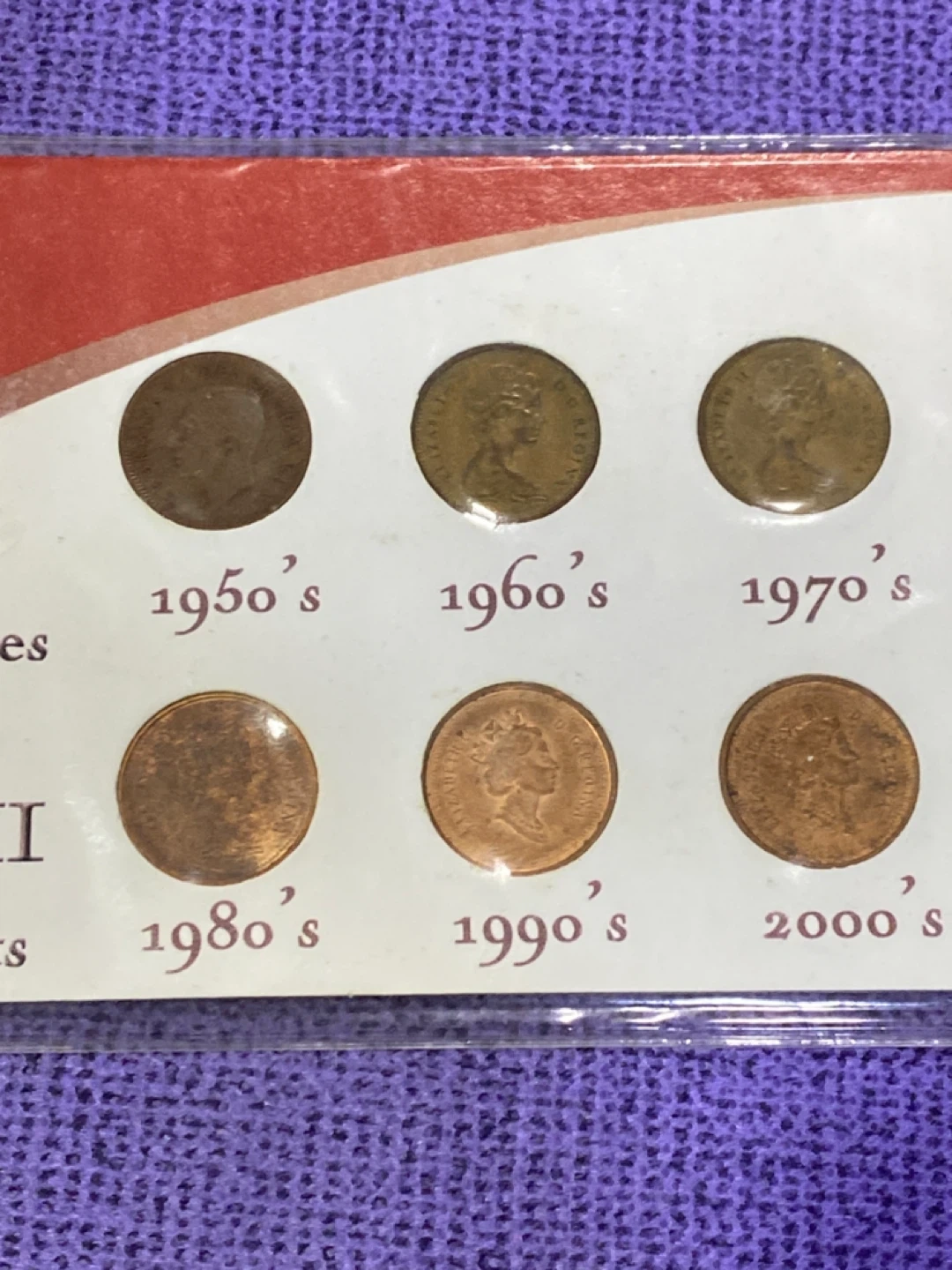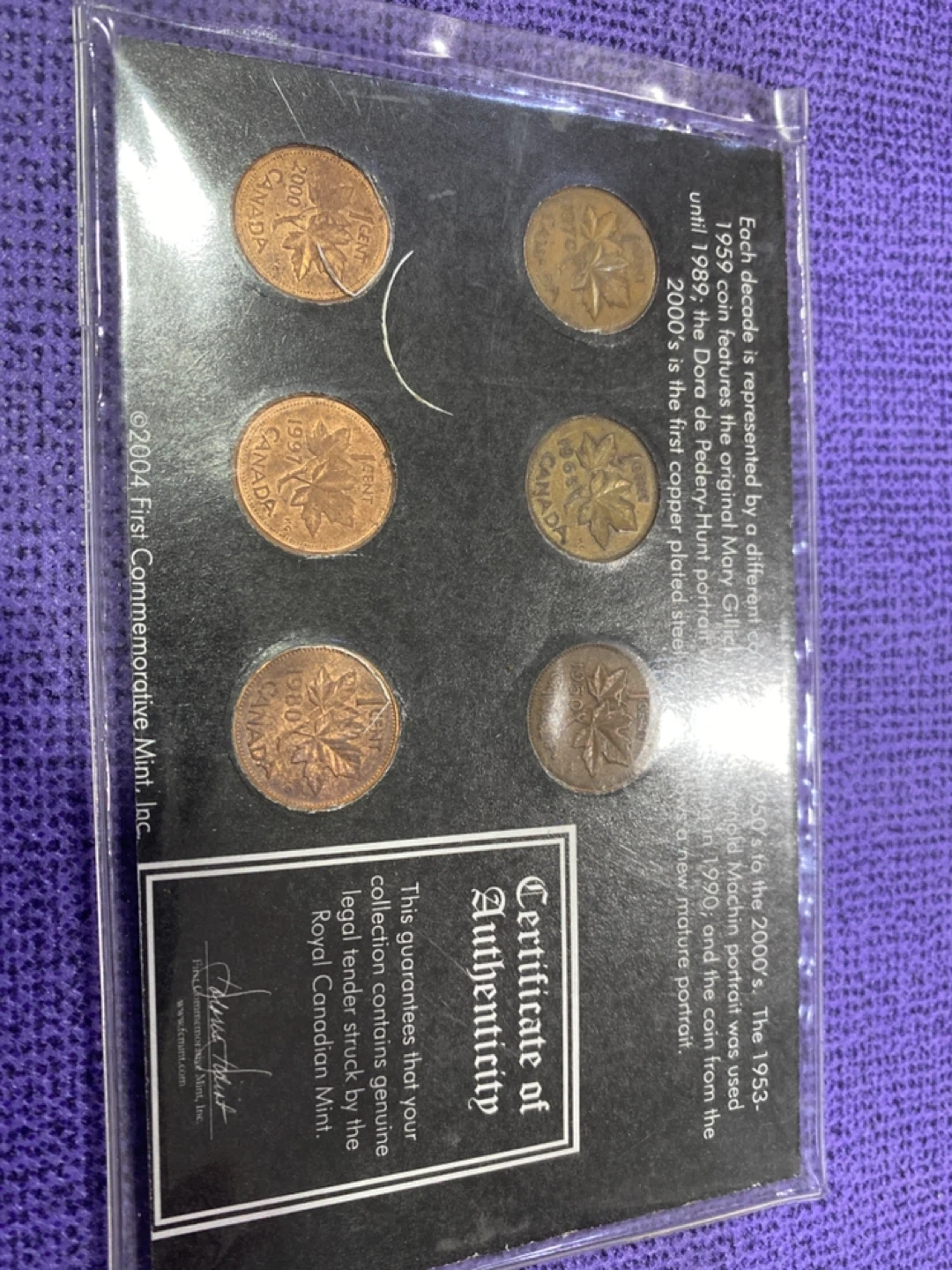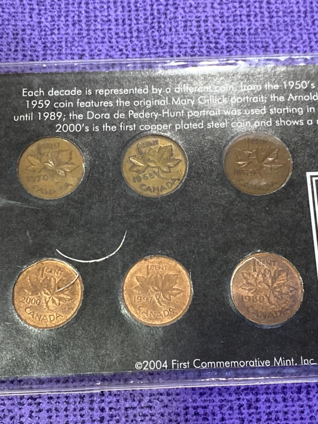 Selling a collection of Canadian pennies, one from each decade from the 1950s to the 2000s. Each coin features a different portrait or design, showing the evolution of the penny over time. Includes a certificate of authenticity from the Royal Canadian Mint.